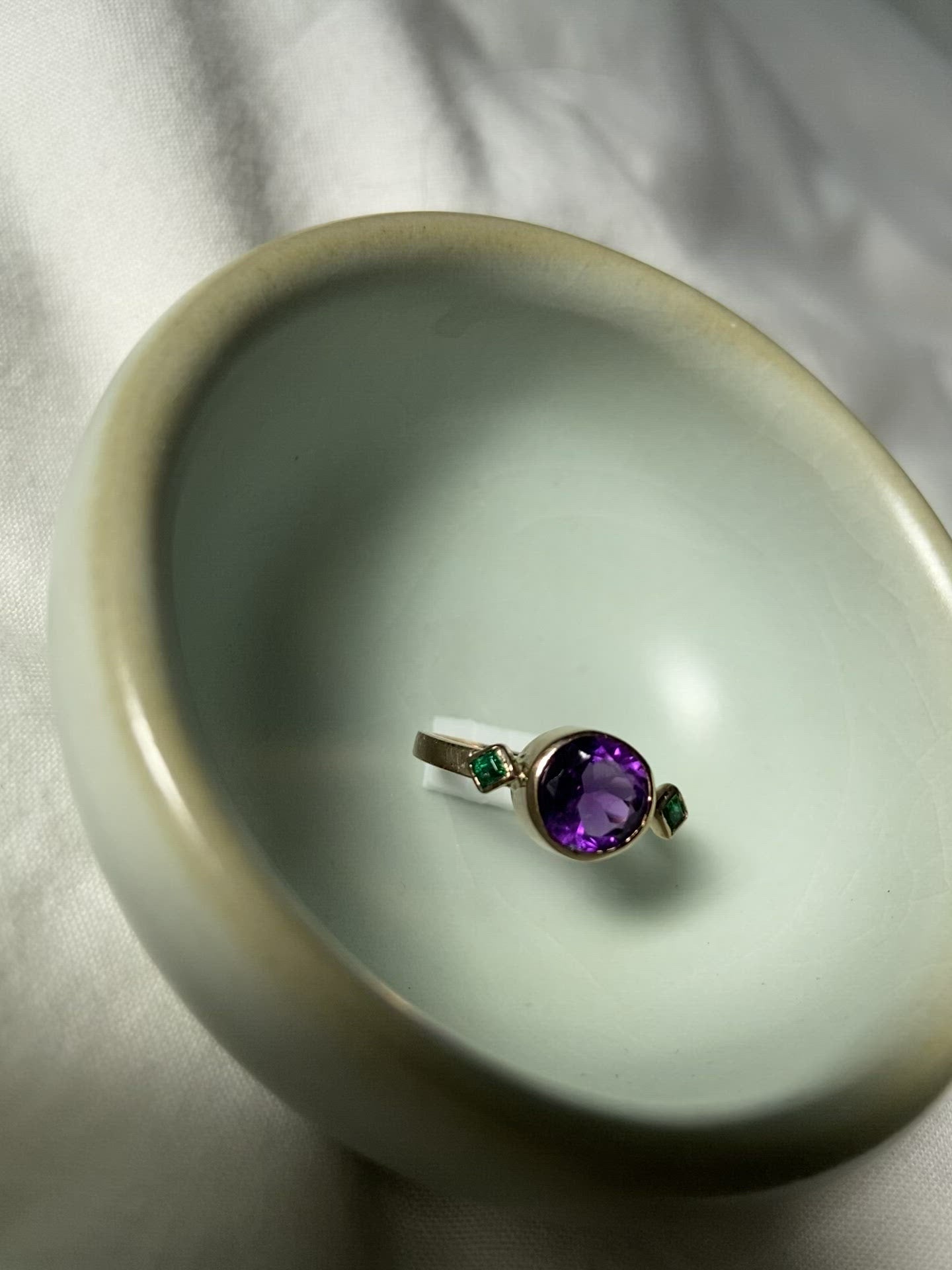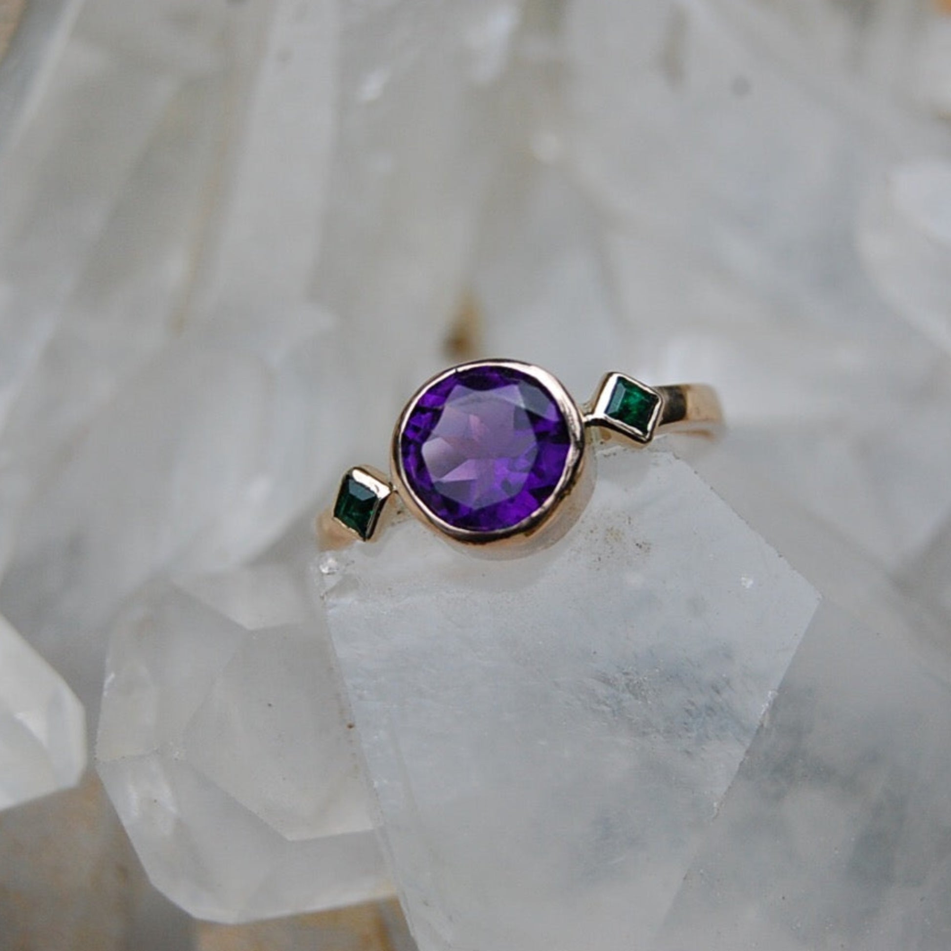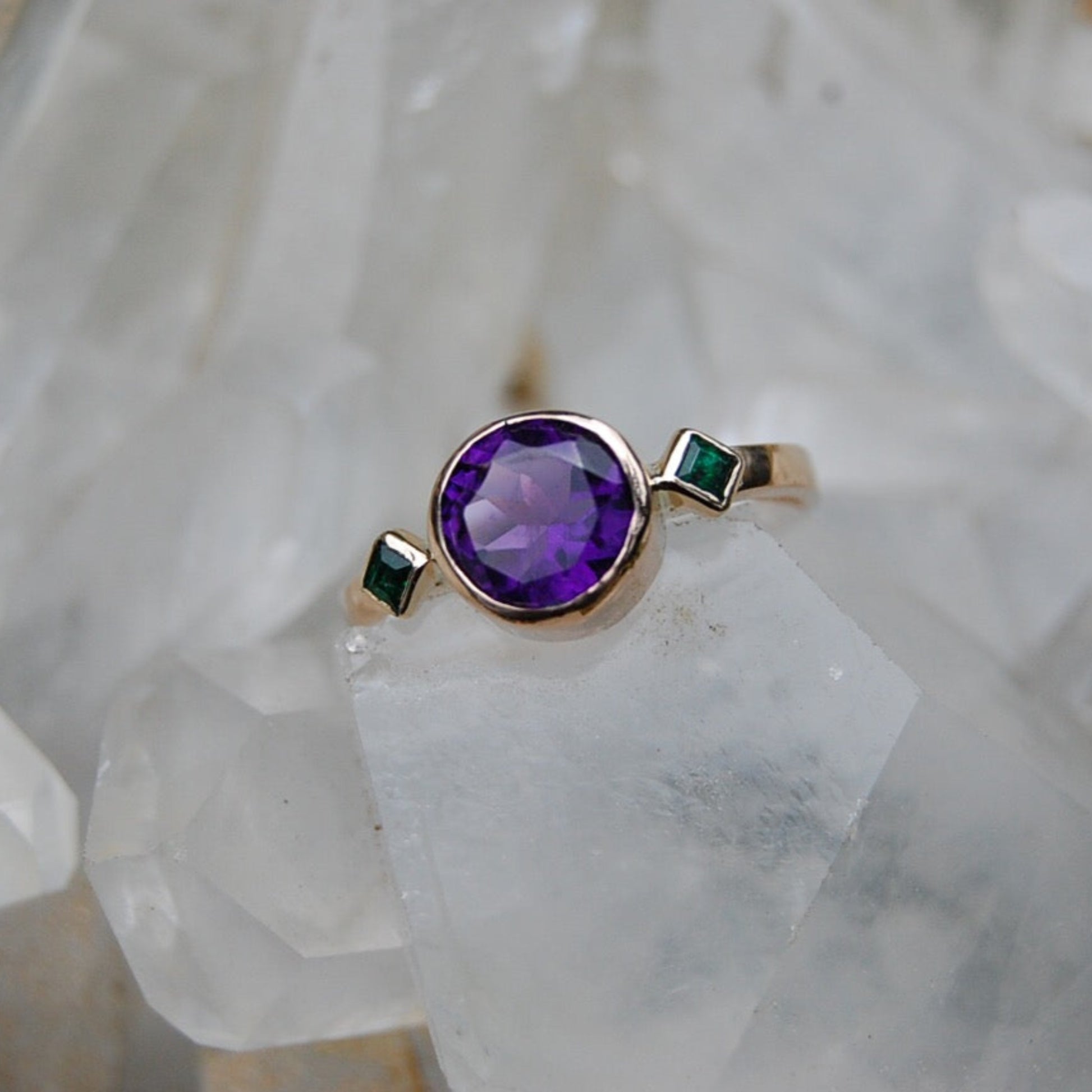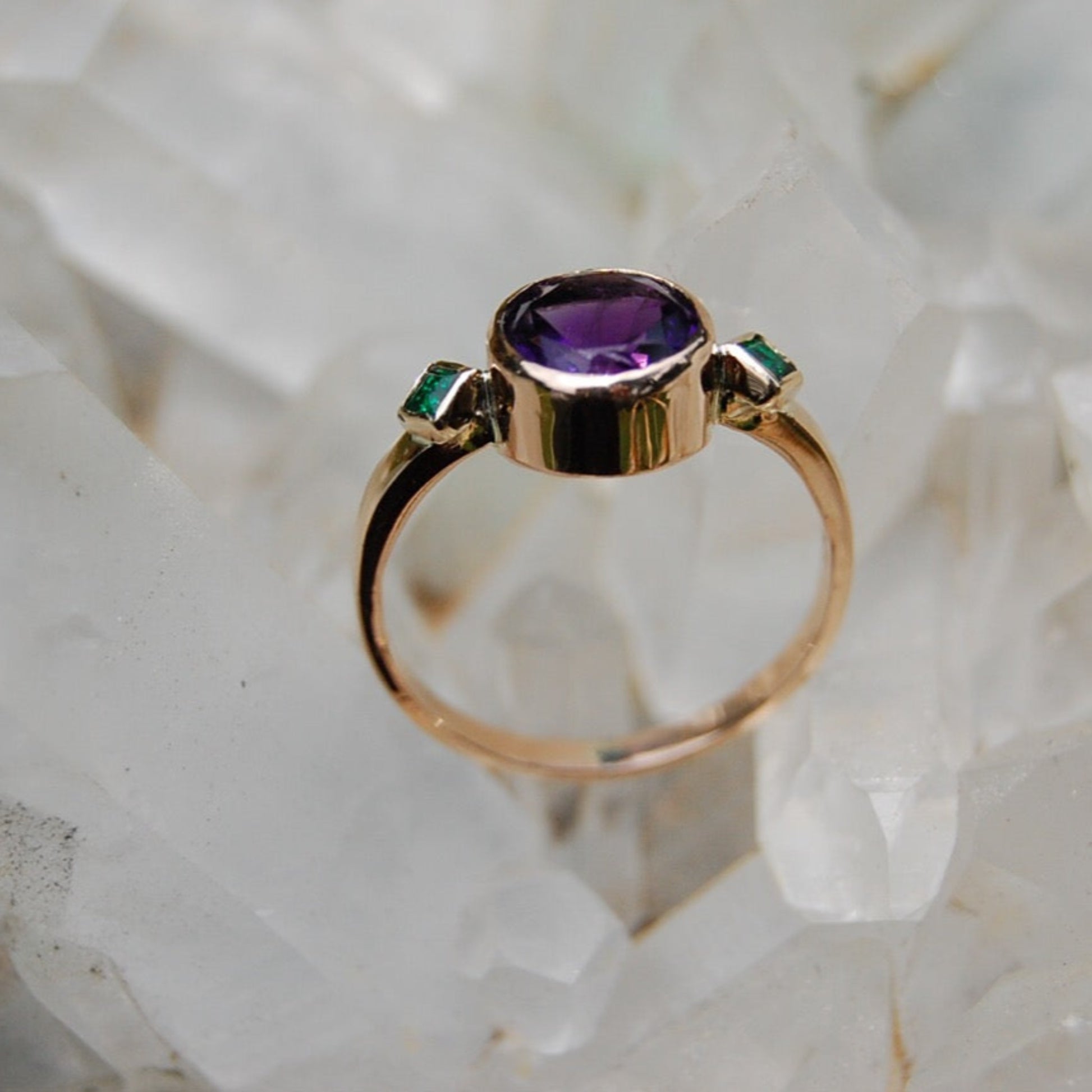 Amethyst and Emerald Rose Gold Ring entirely handcrafted by Anica Lin in her studio. Amethyst is the February birthstone and the perfect special ring for your loved one.