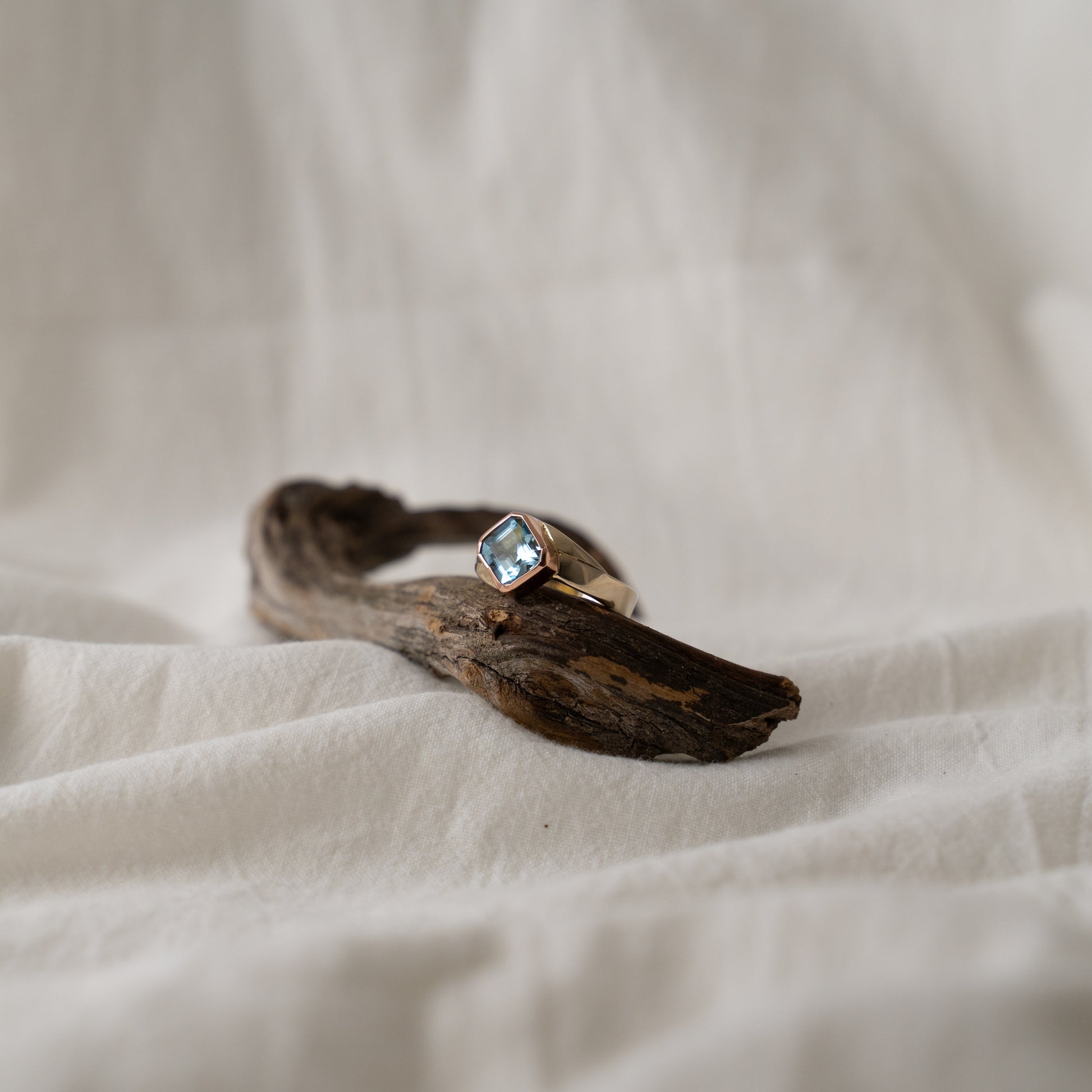 This wonderful ring is made of dual metals, a process in which two metals of different colors are soldered together and it is one of my favorite looks. It adds a unique touch to the entire design of the ring. She chose the aquamarine as it was one of her favorite gemstones and coincidentally was the state gemstone of Colorado (something she wanted to be reminded of in her ring design). She loved the minimal design with an asymmetrical setting which we accomplished in the final product. I loved working with this couple and it made me really happy when they received their one-of-a-kind rings.