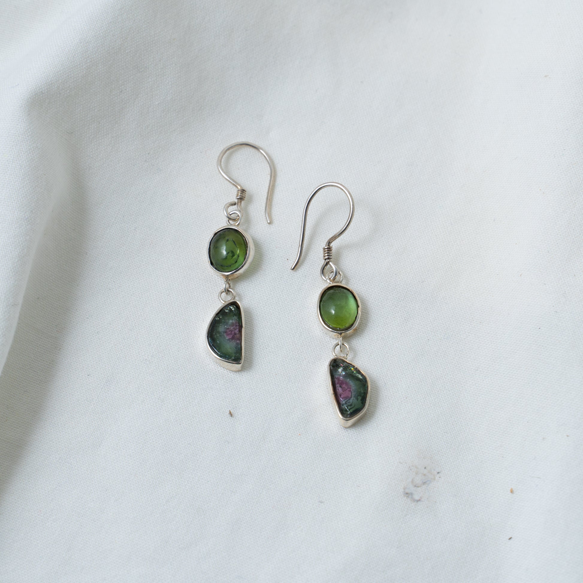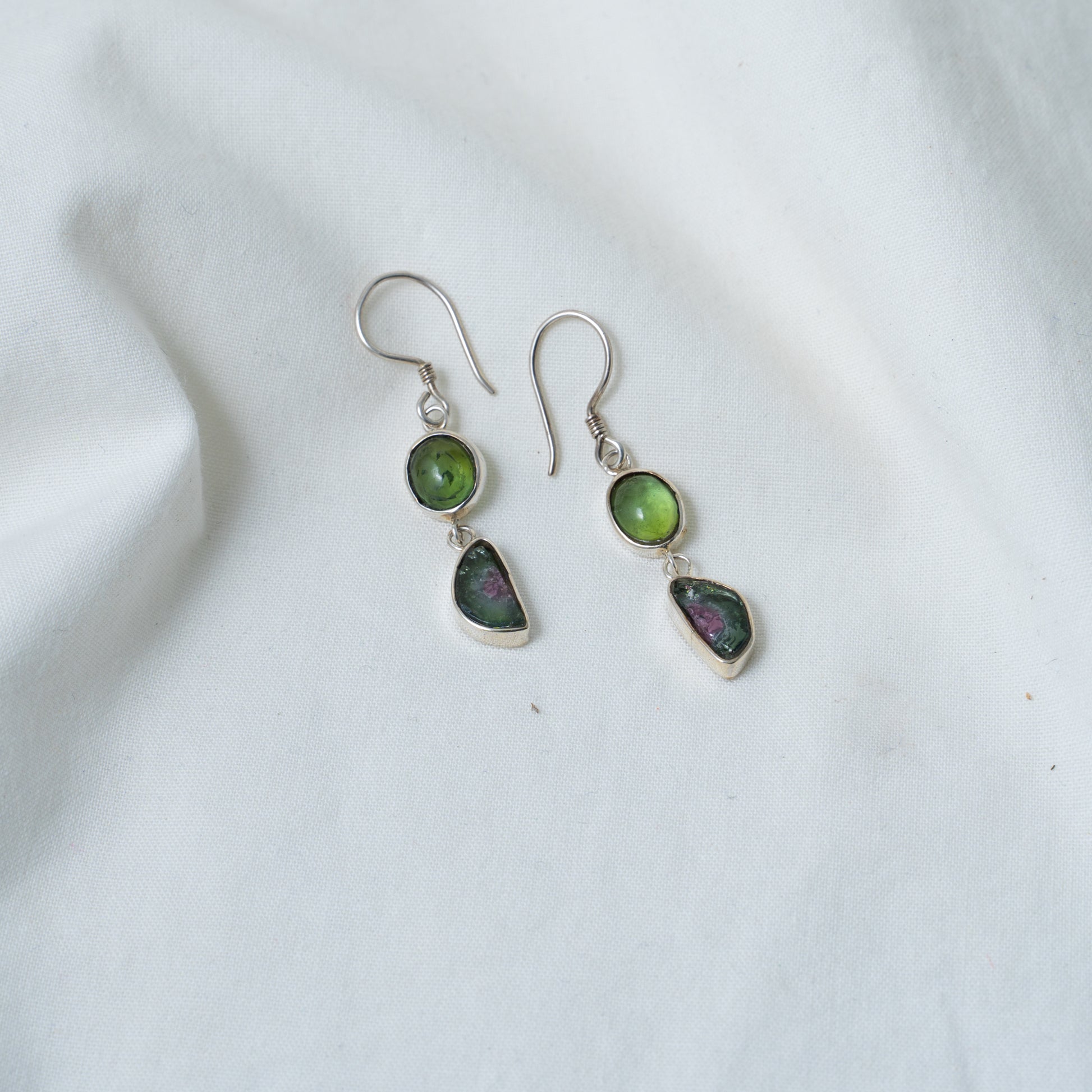 Entirely designed and handcrafted pair of earrings with naturally shaped oval and semi circle tourmalines.