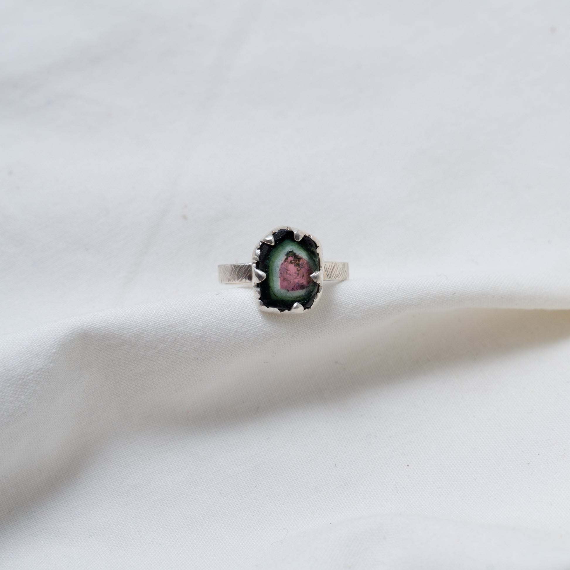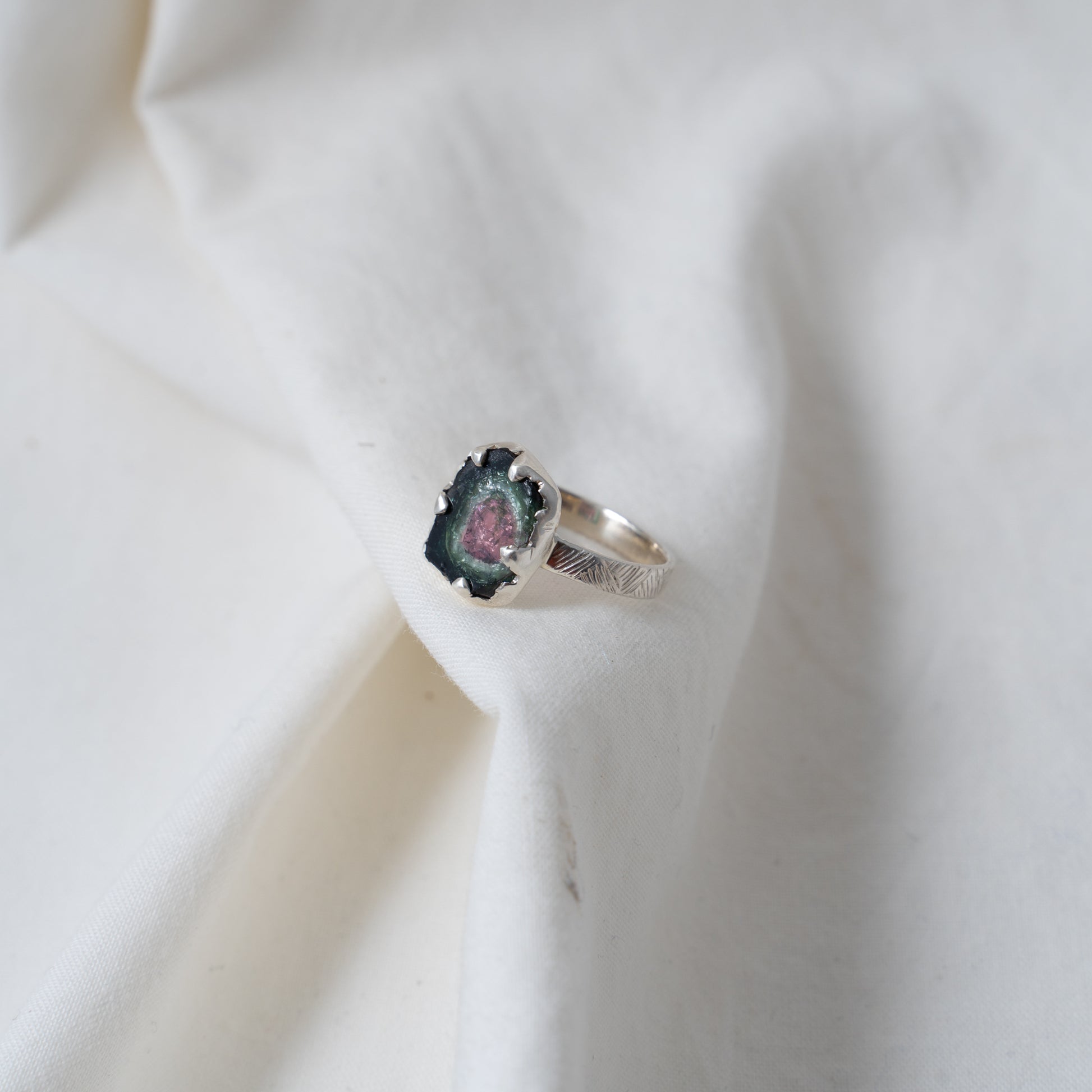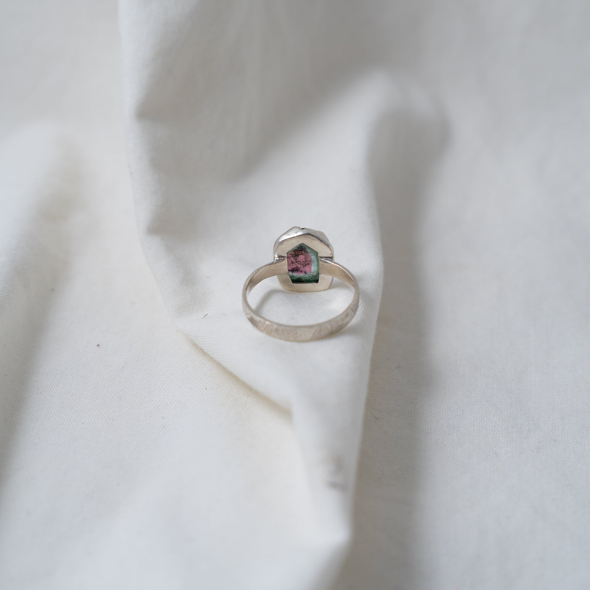 Organically shaped watermelon tourmaline silver ring