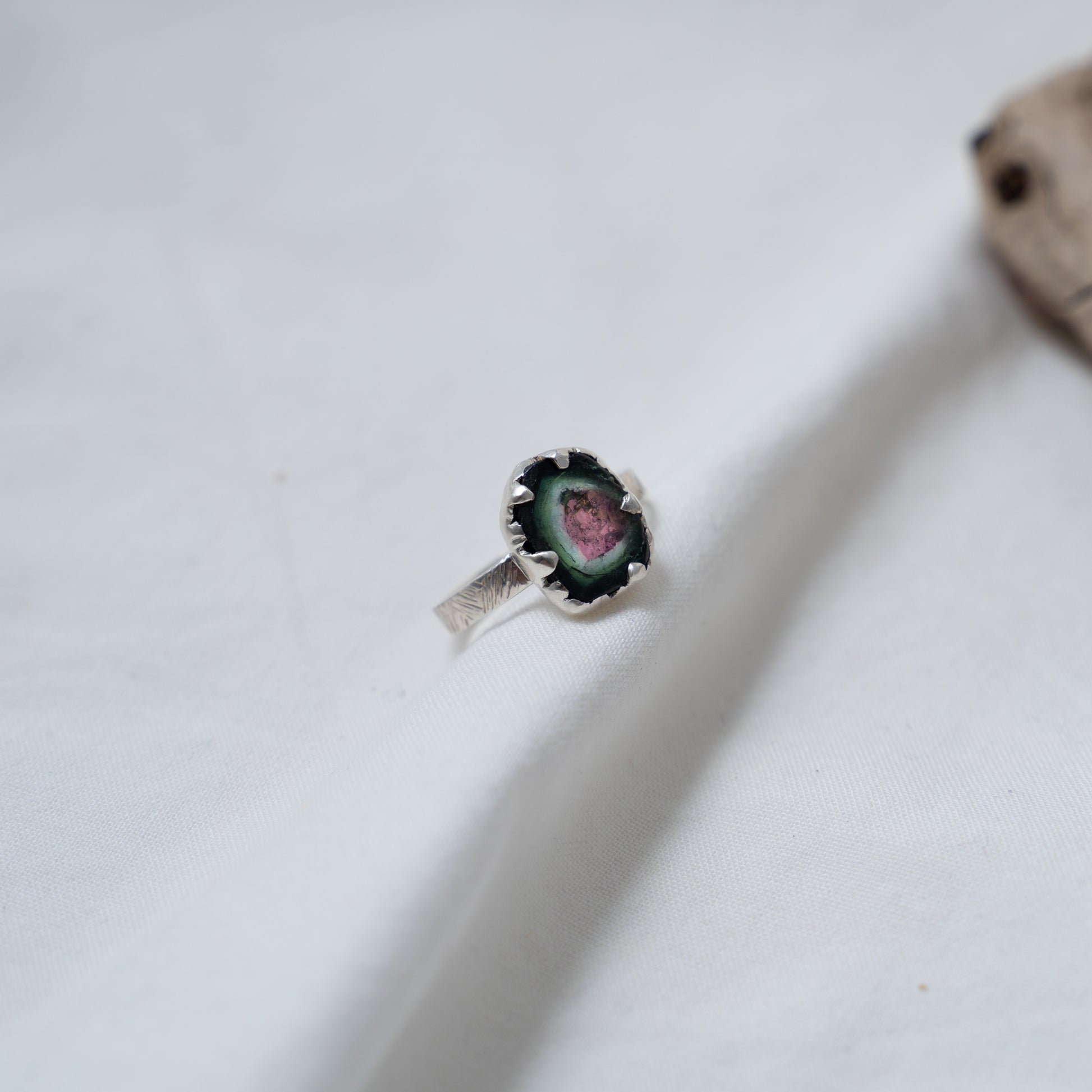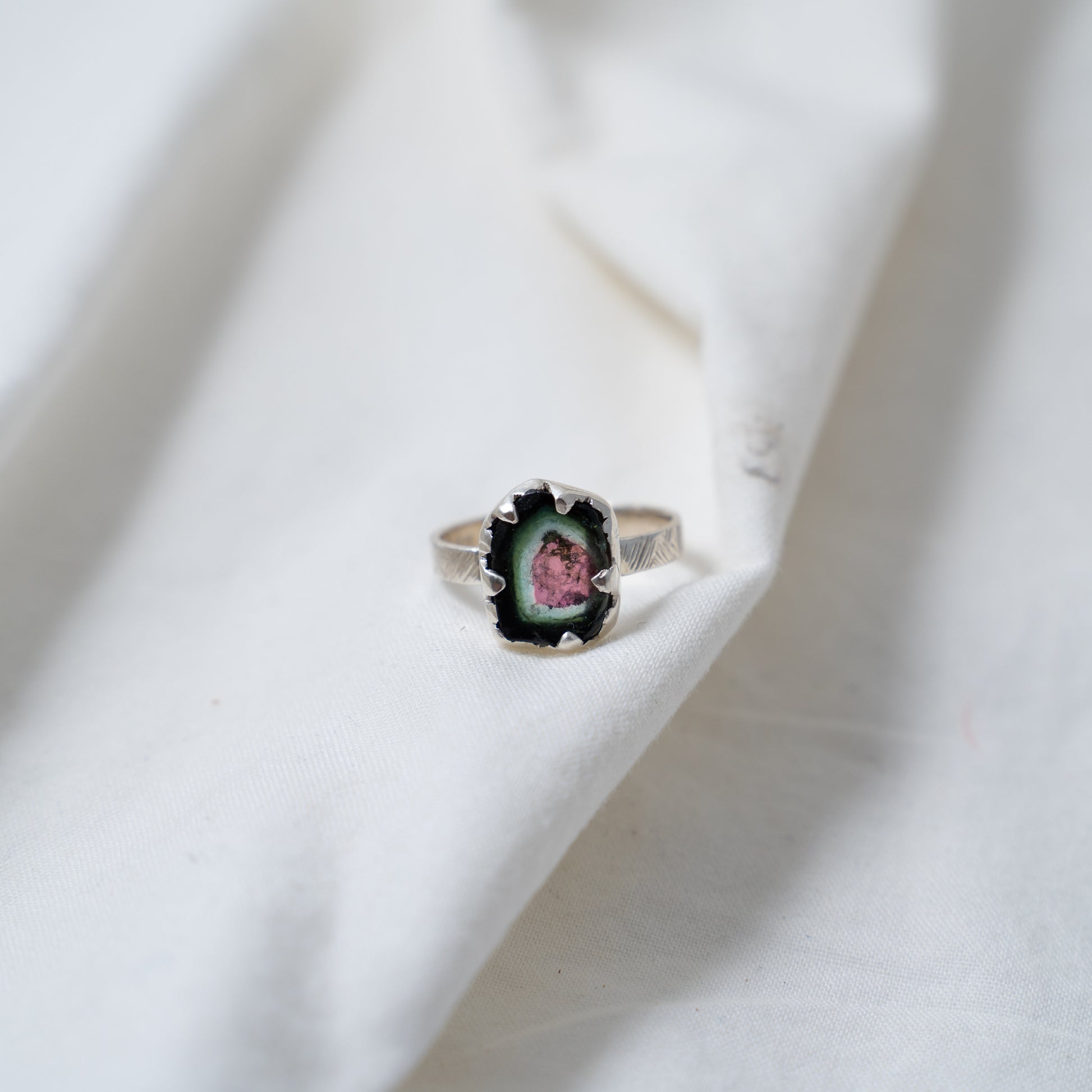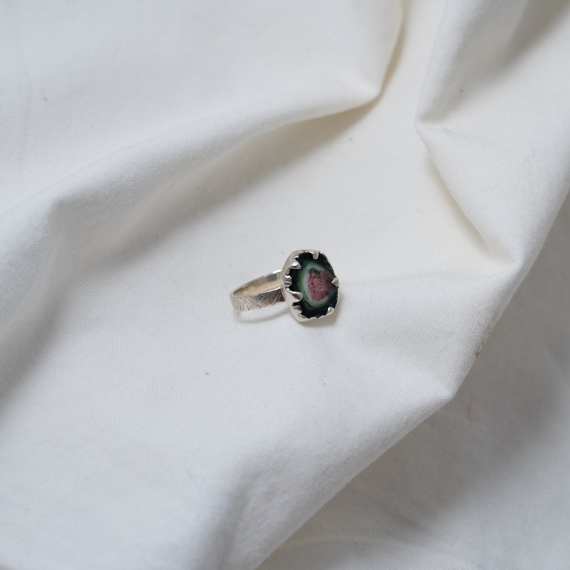 Organically shaped watermelon tourmaline silver ring