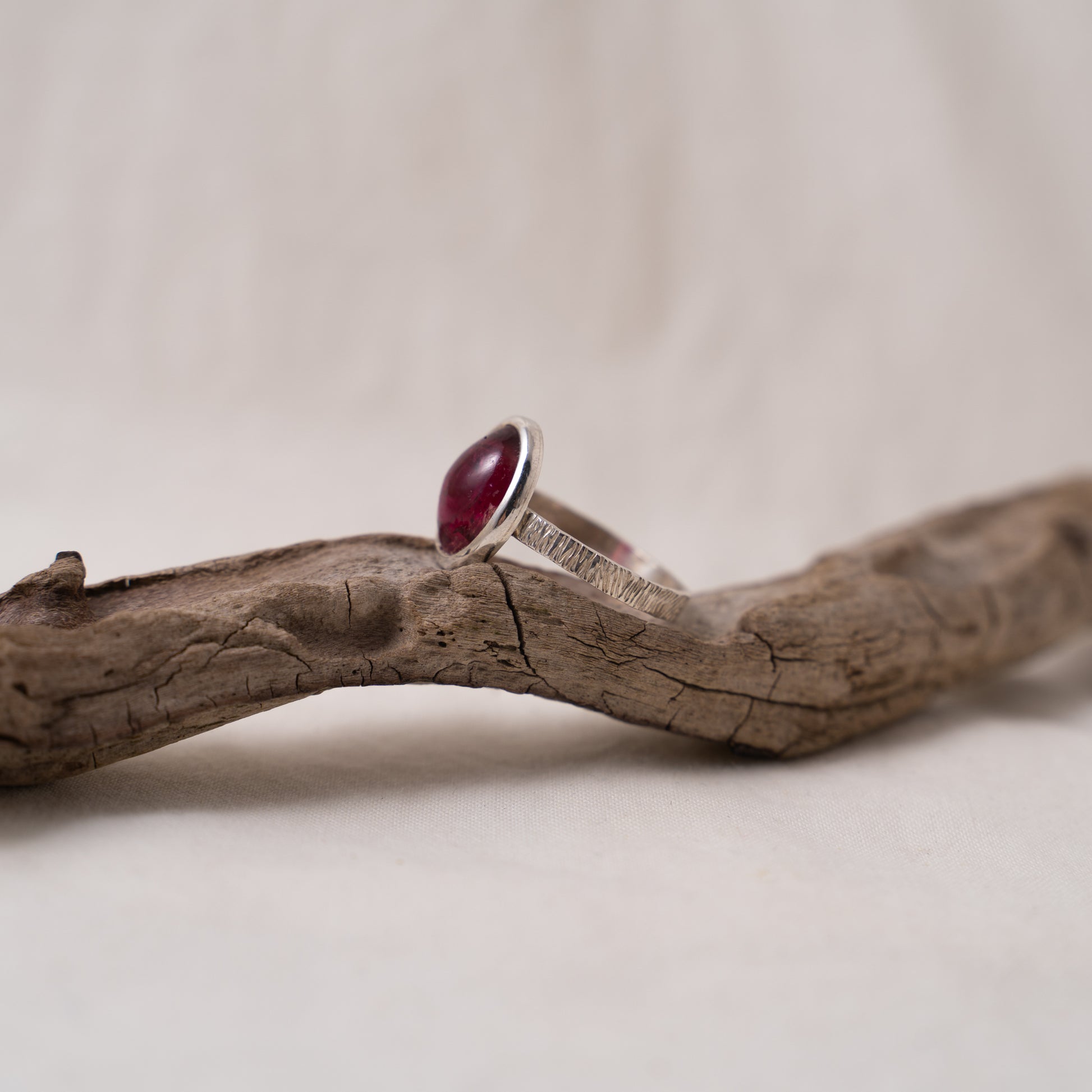 Introducing my handcrafted ring showcasing a vivid authentic pink oval cabochon tourmaline. Set in a thick silver bezel with a textured ring shank (band), this piece blends artisan craftsmanship with natural beauty, offering a distinctive and elegant statement.