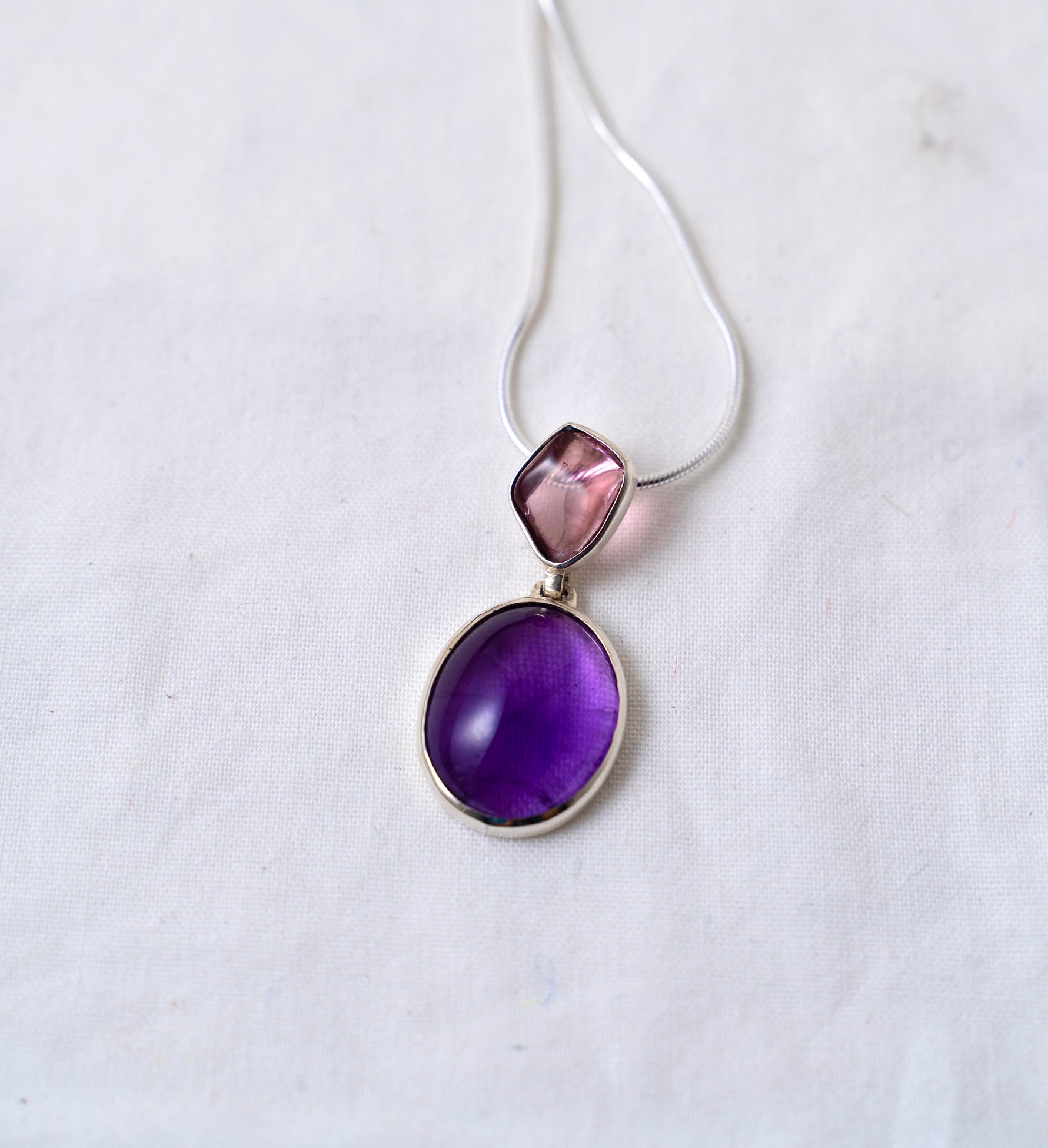 Explore my handcrafted, one-of-a-kind silver pendant featuring a captivating amethyst and a vibrant pink tourmaline.