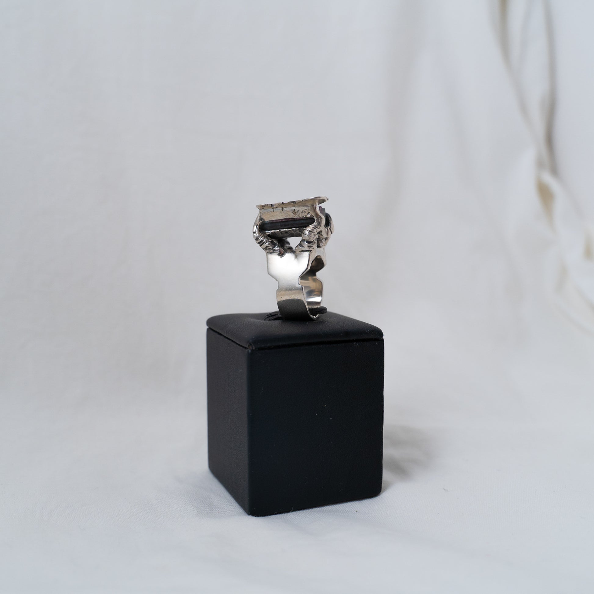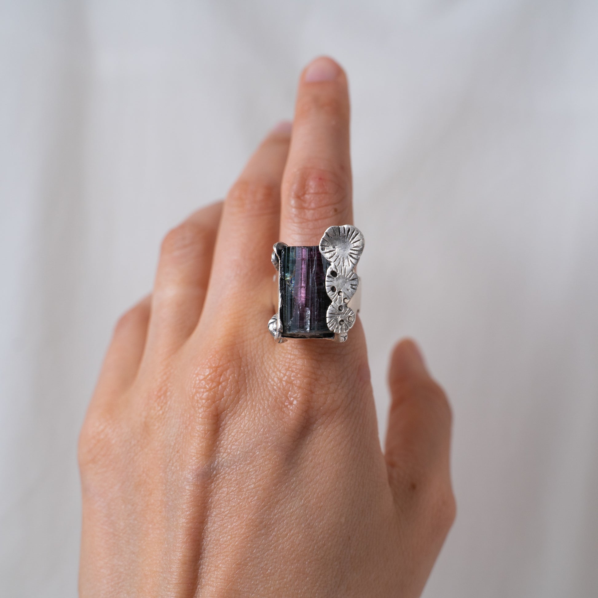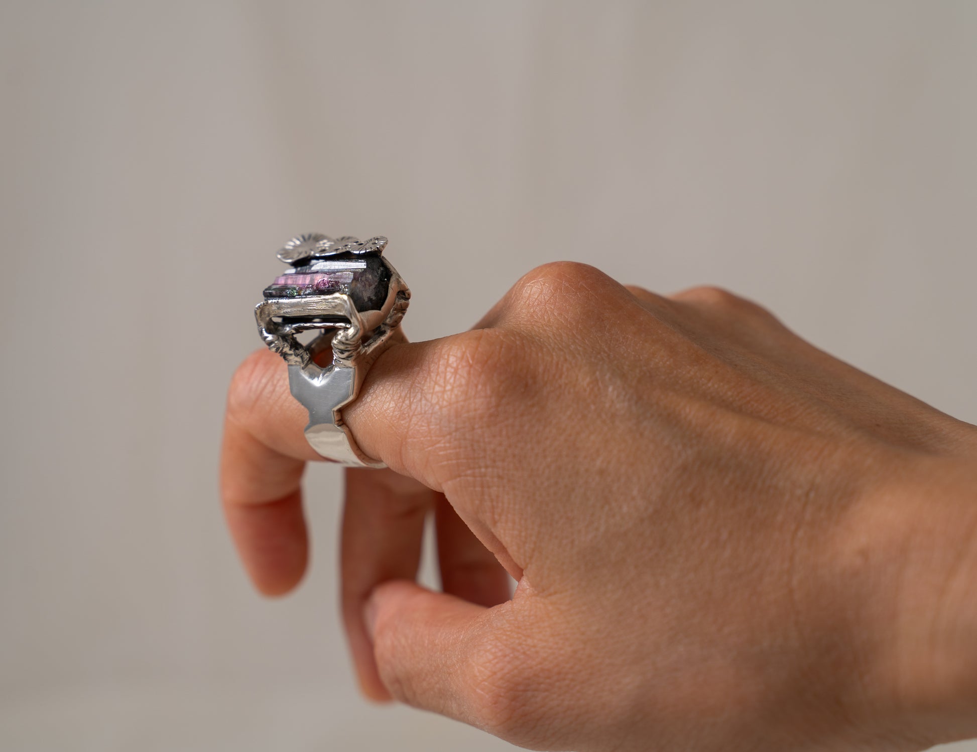 The Savannah Ring, oxidized sterling silver hand sculpted and cast from wax with a hand set raw watermelon tourmaline crystal in this iconic statement ring