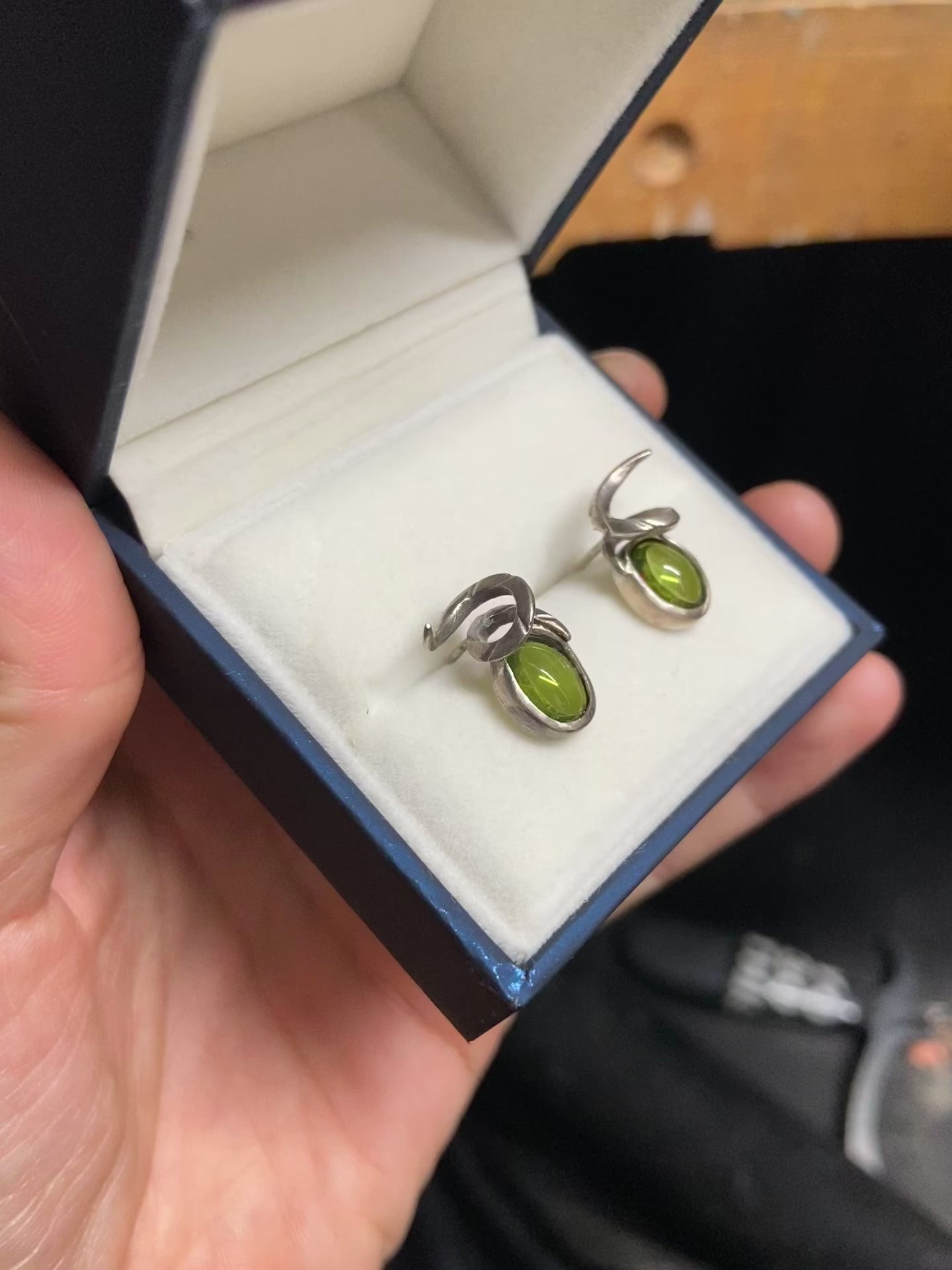 Materials: Sterling silver with gun‑metal finish, set with genuine peridot cabochon