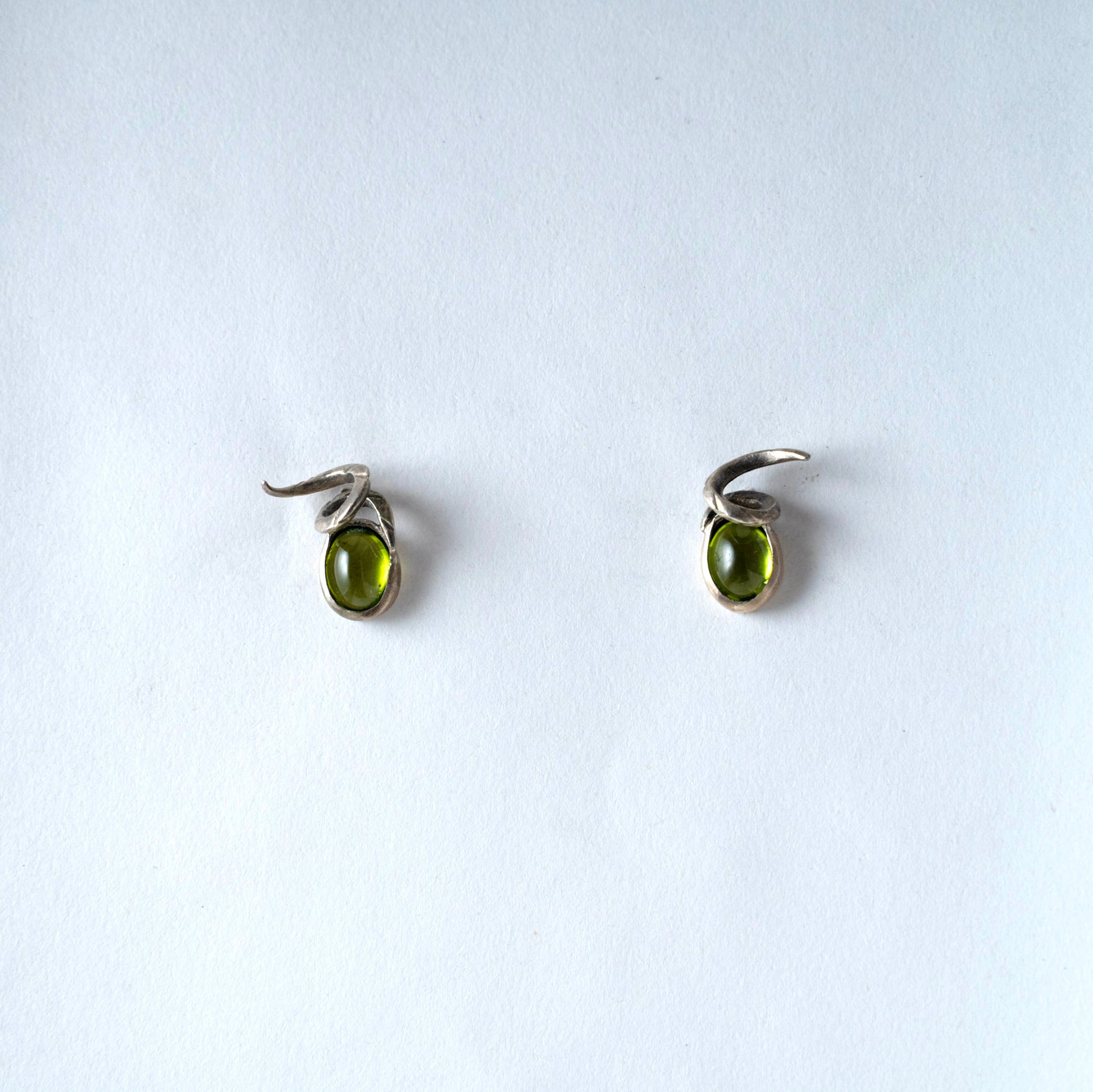 At the heart of each stud, a genuine peridot gemstone captures sunlight in lush green tones, offering a glint of life amid oxidized steel shadows. The contrast between darkened silver and vibrant peridot creates a subtle tension that’s both unexpected and refined.