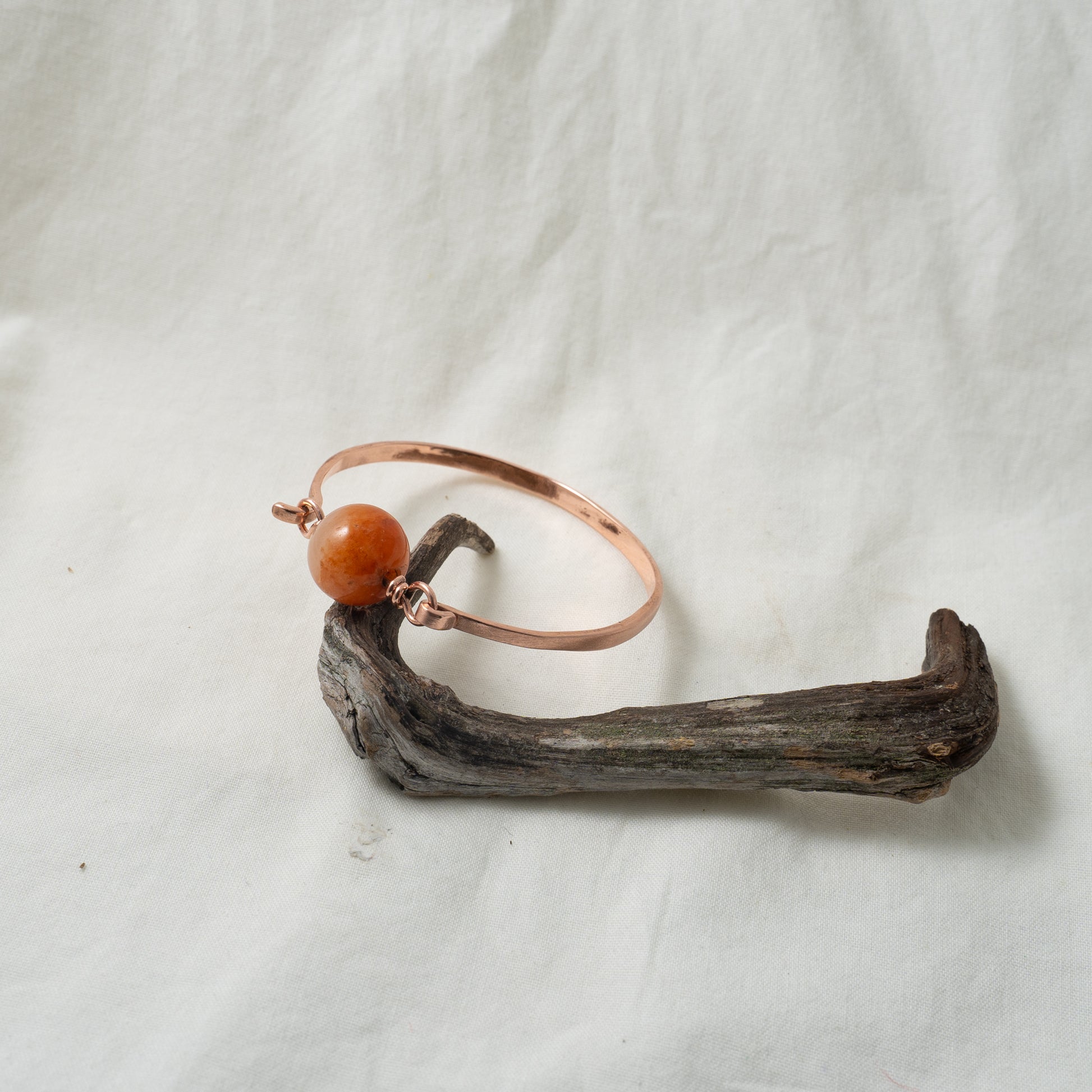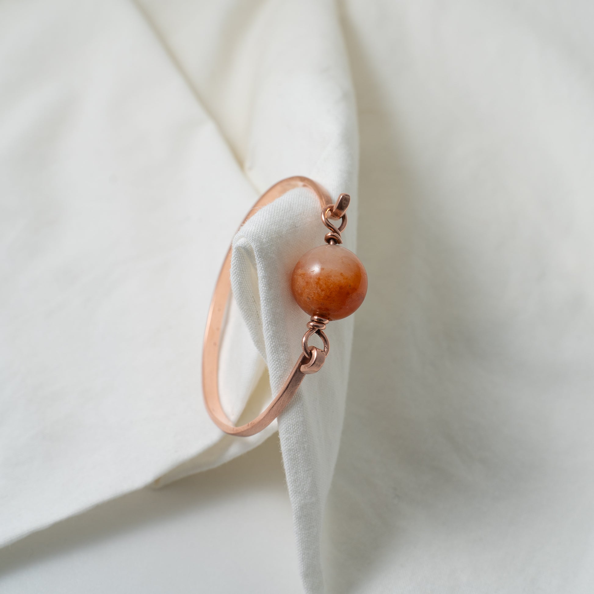 This beautiful bangle is constructed with copper as it's warm color compliments the color of the Jade.
