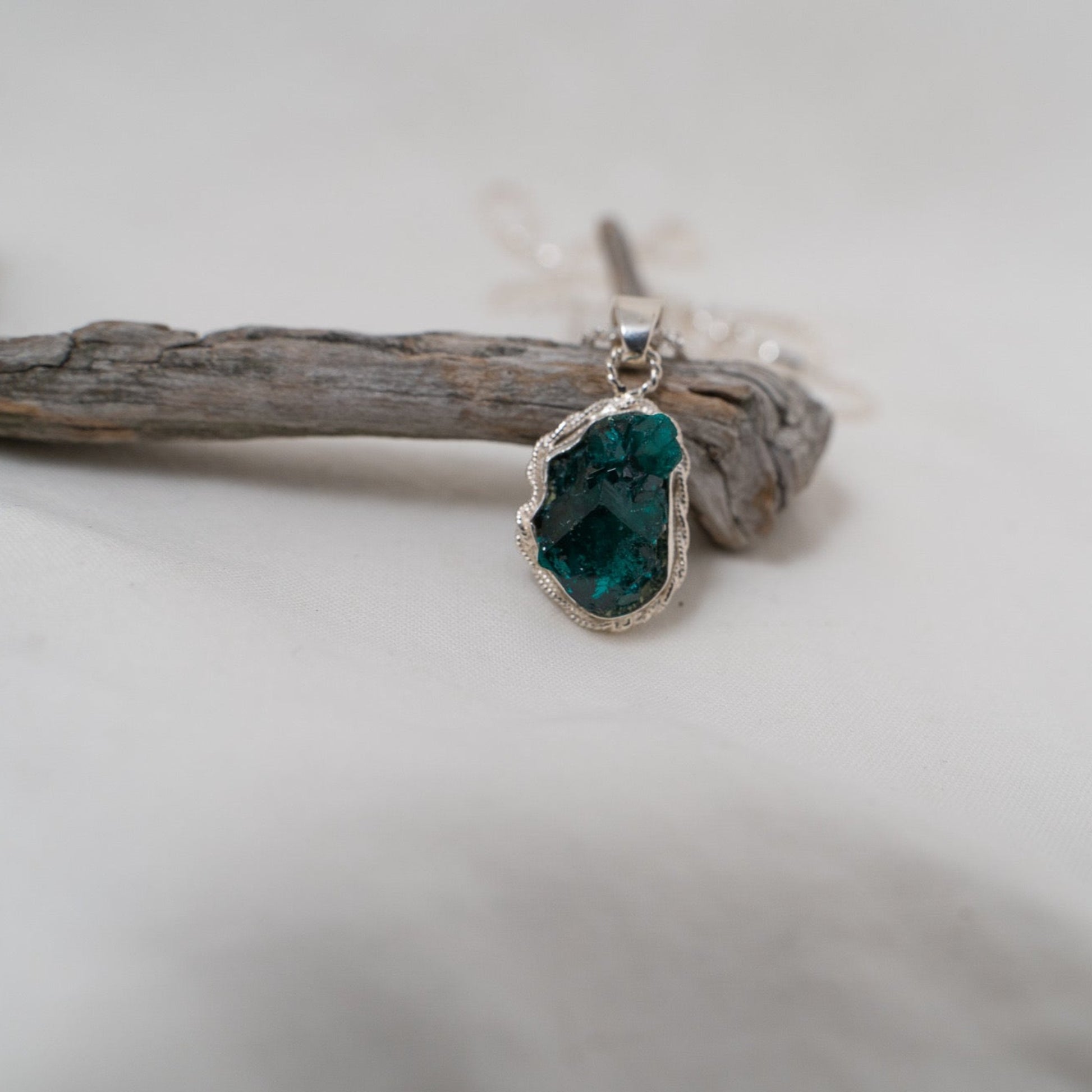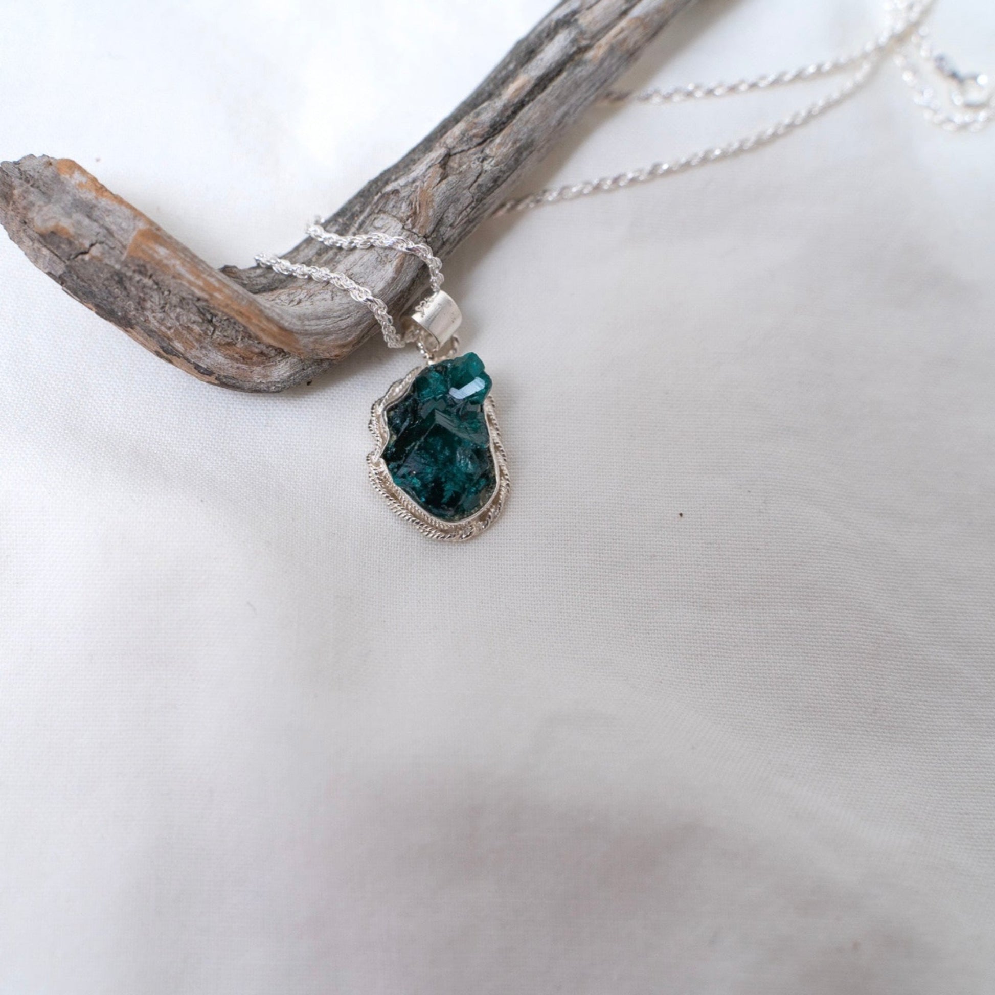 This delicate dioptase is handcrafted and set in sterling silver. Dioptases carry a rich, deep green color and this one in particular has a three dimensional, crystal structure that stands out with the setting. A wonderful piece to add to your wardrobe, as if you’re carrying reminders of forests and nature around with you.