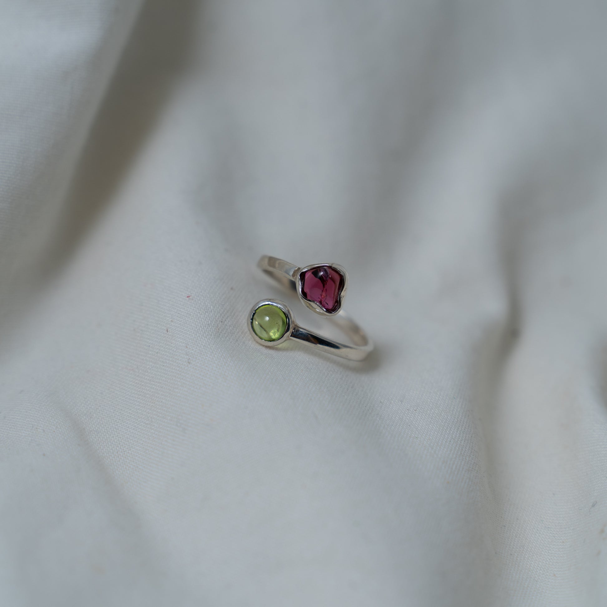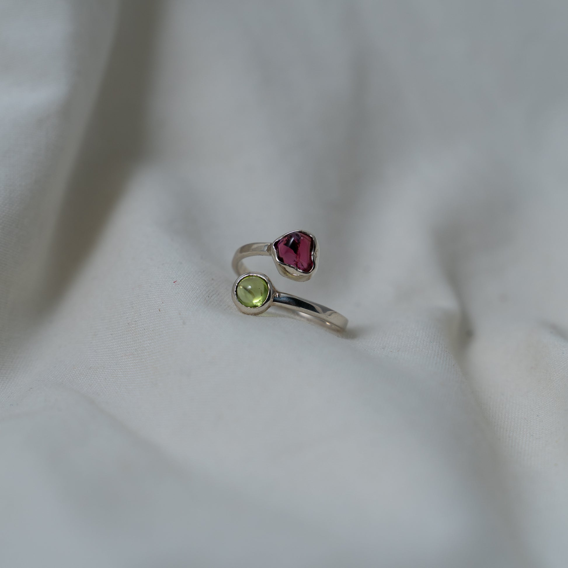 Entirely handcrafted open silver ring with peridot and rhodalite garnet cabochons.