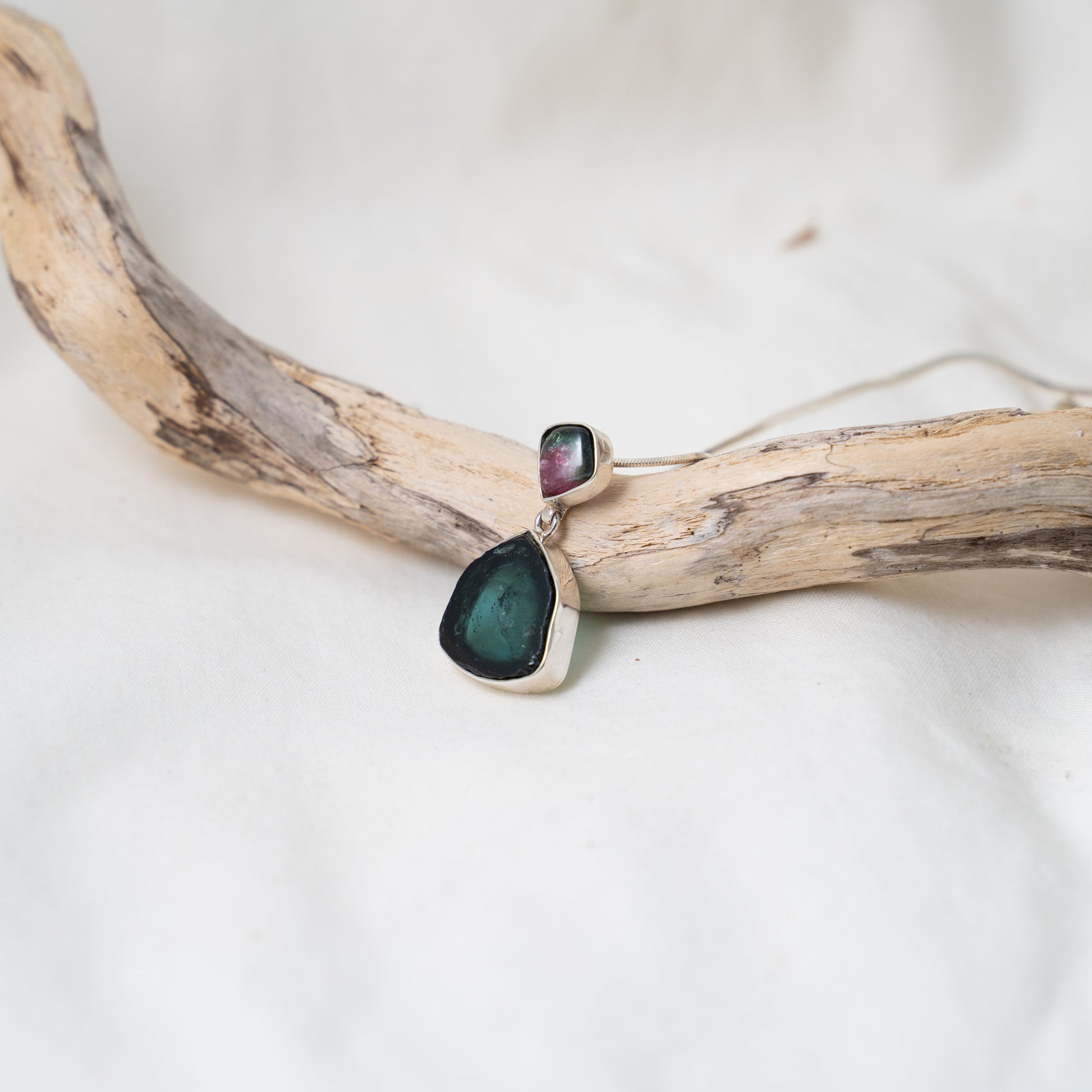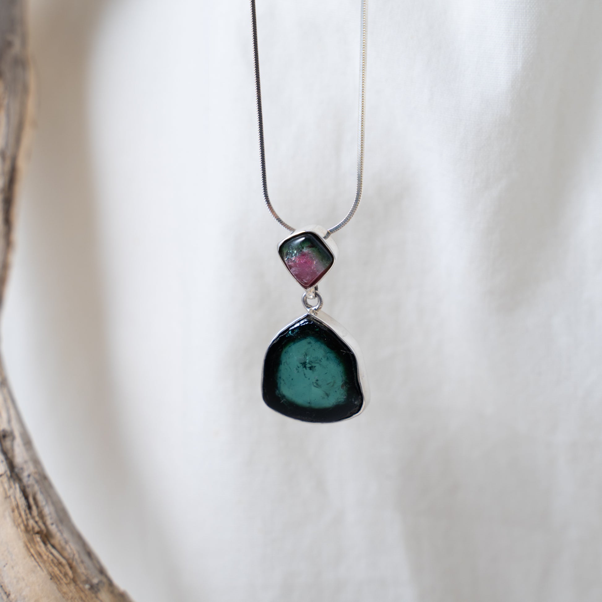 Both gemstones are watermelon tourmalines and have unique color combinations. They are designed to compliment one another in shape, size and color. A perfect pendant that can be dressed up and down.