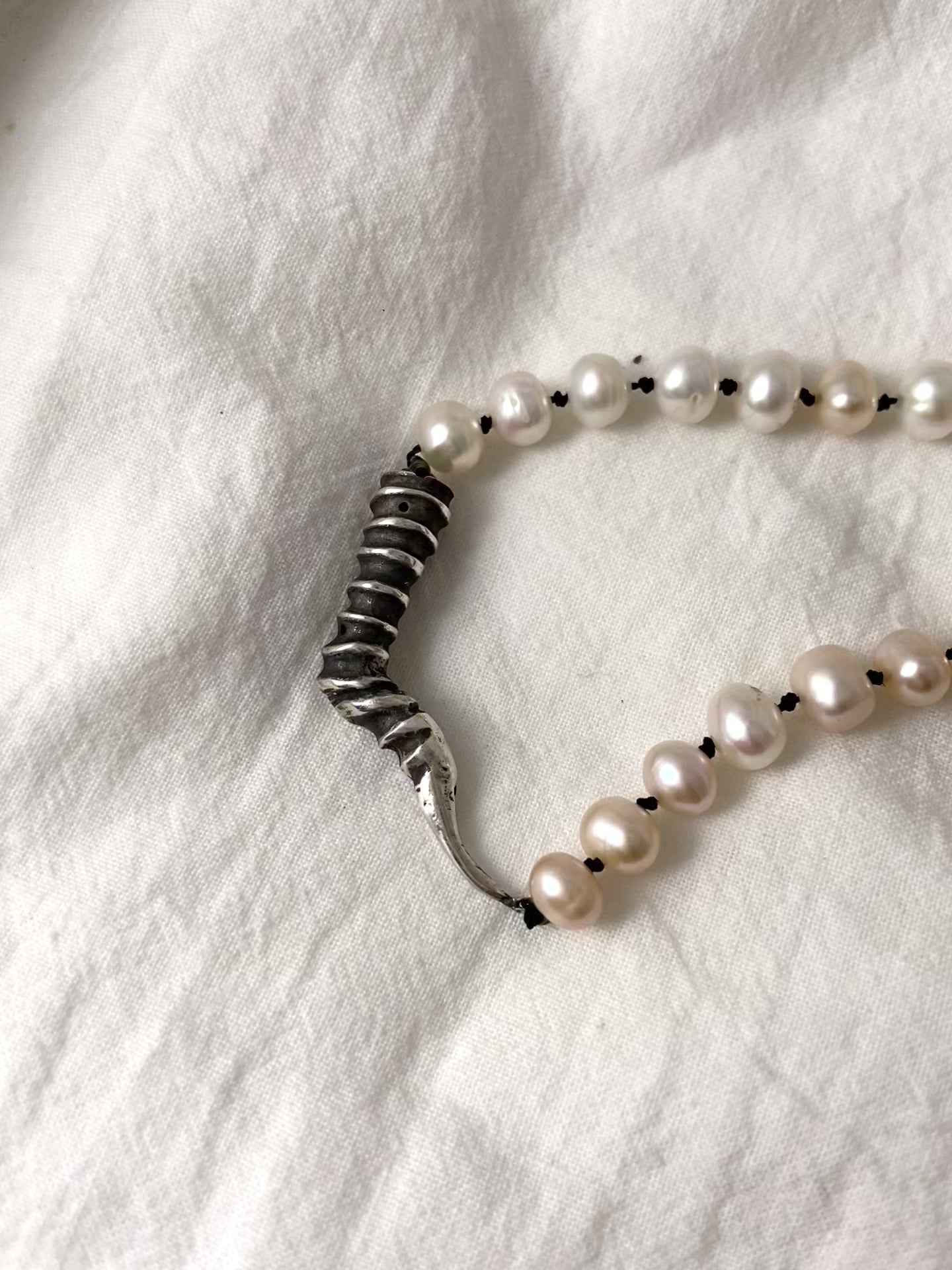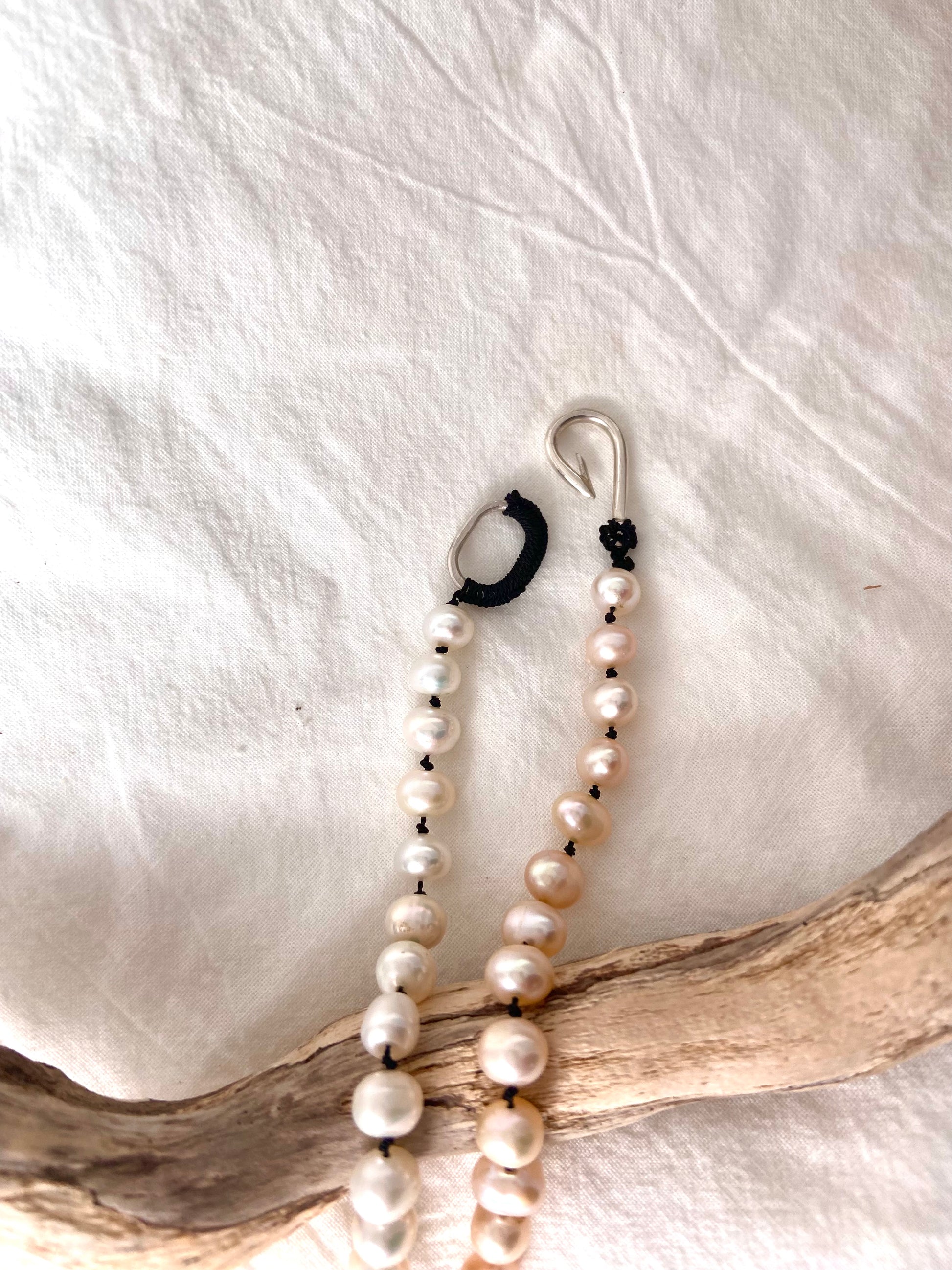 Designed to stand out, this statement pearl necklace offers a unique twist on the classic string of pearls. Pearls, revered for their timeless elegance, remain extremely popular today. Each pearl is carefully hand-strung with black nylon thread and secured with a handmade clasp, ensuring durability and elegance. Enhance your look with this one-of-a-kind creation, perfect for those who appreciate artisan craftsmanship and desire a pearl necklace with a touch of flair.