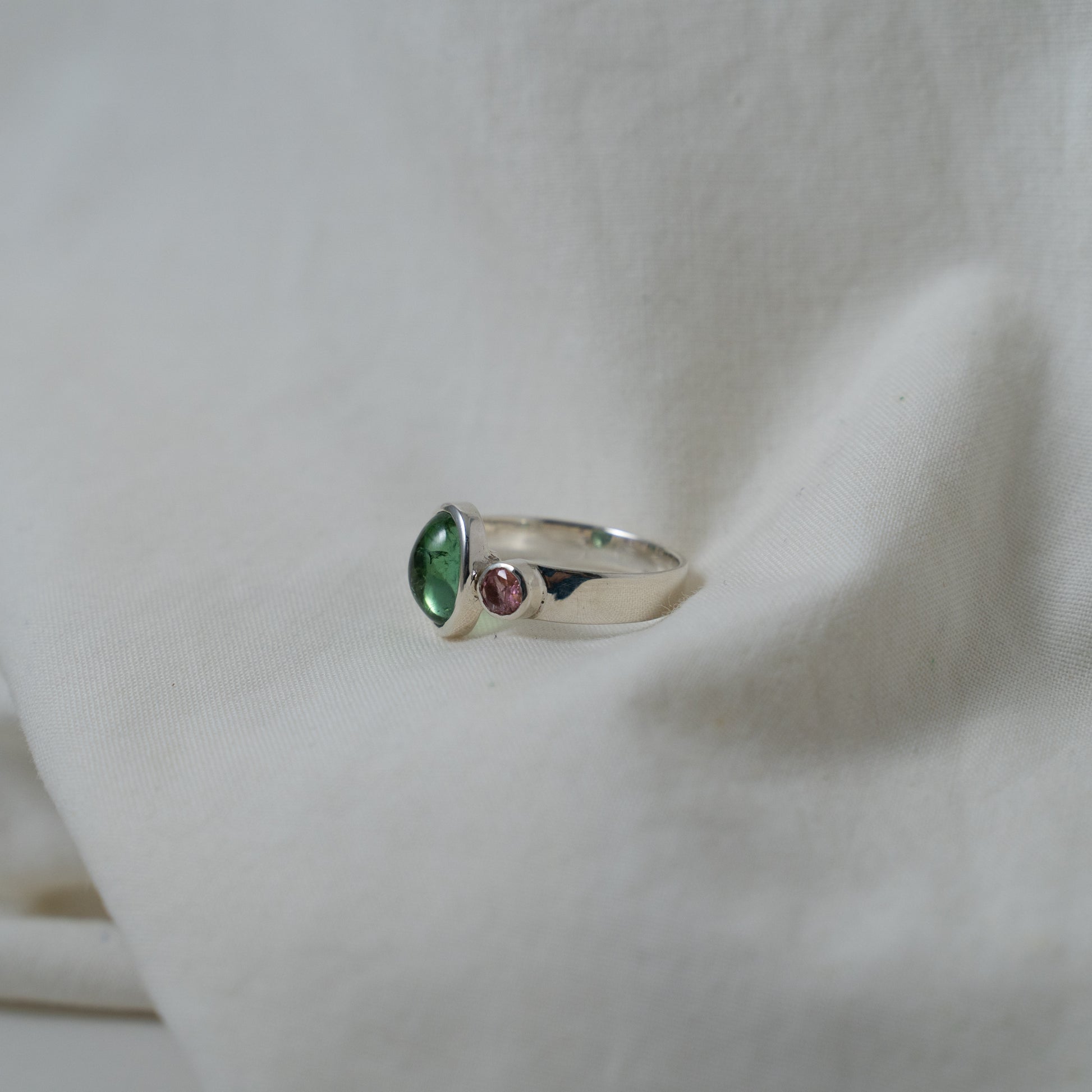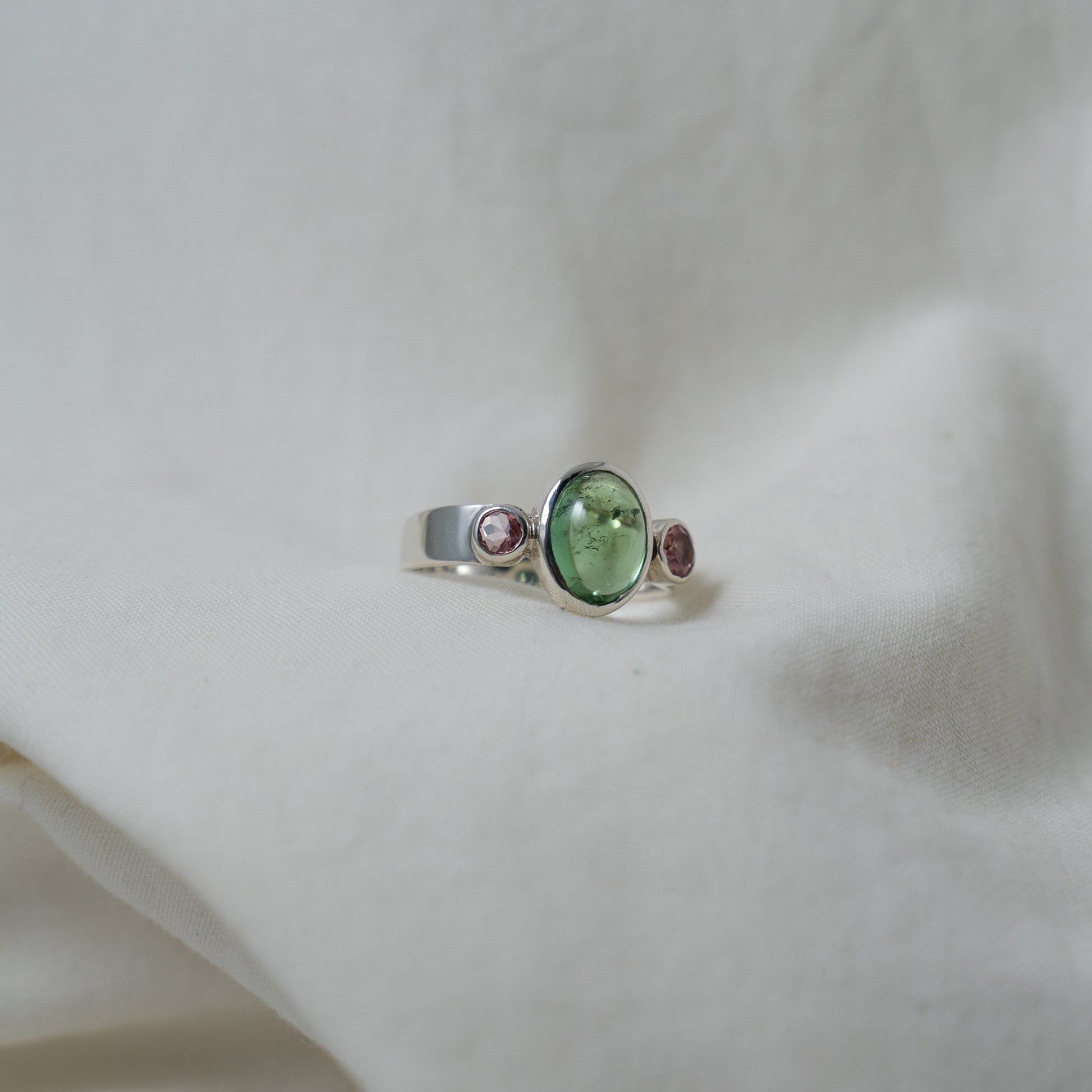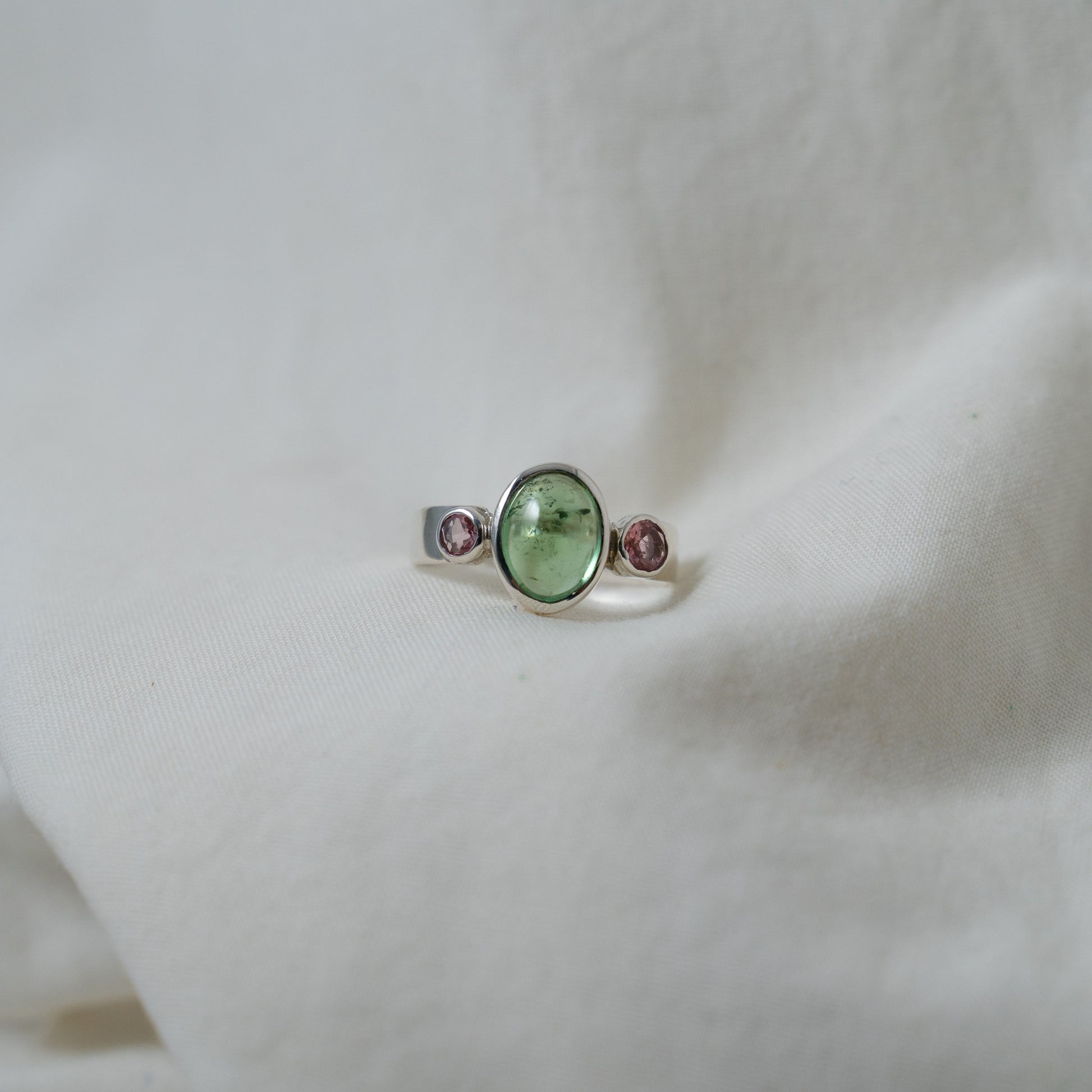 Stylishly crafted with a hand fabricated silver ring, this green tourmaline and pink sapphire ring radiates elegance and sophistication. Its oval semi-precious green tourmaline cabochon and round cut pink sapphires provide a stunning contrast and luxury look.