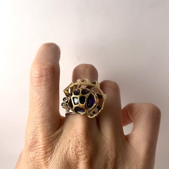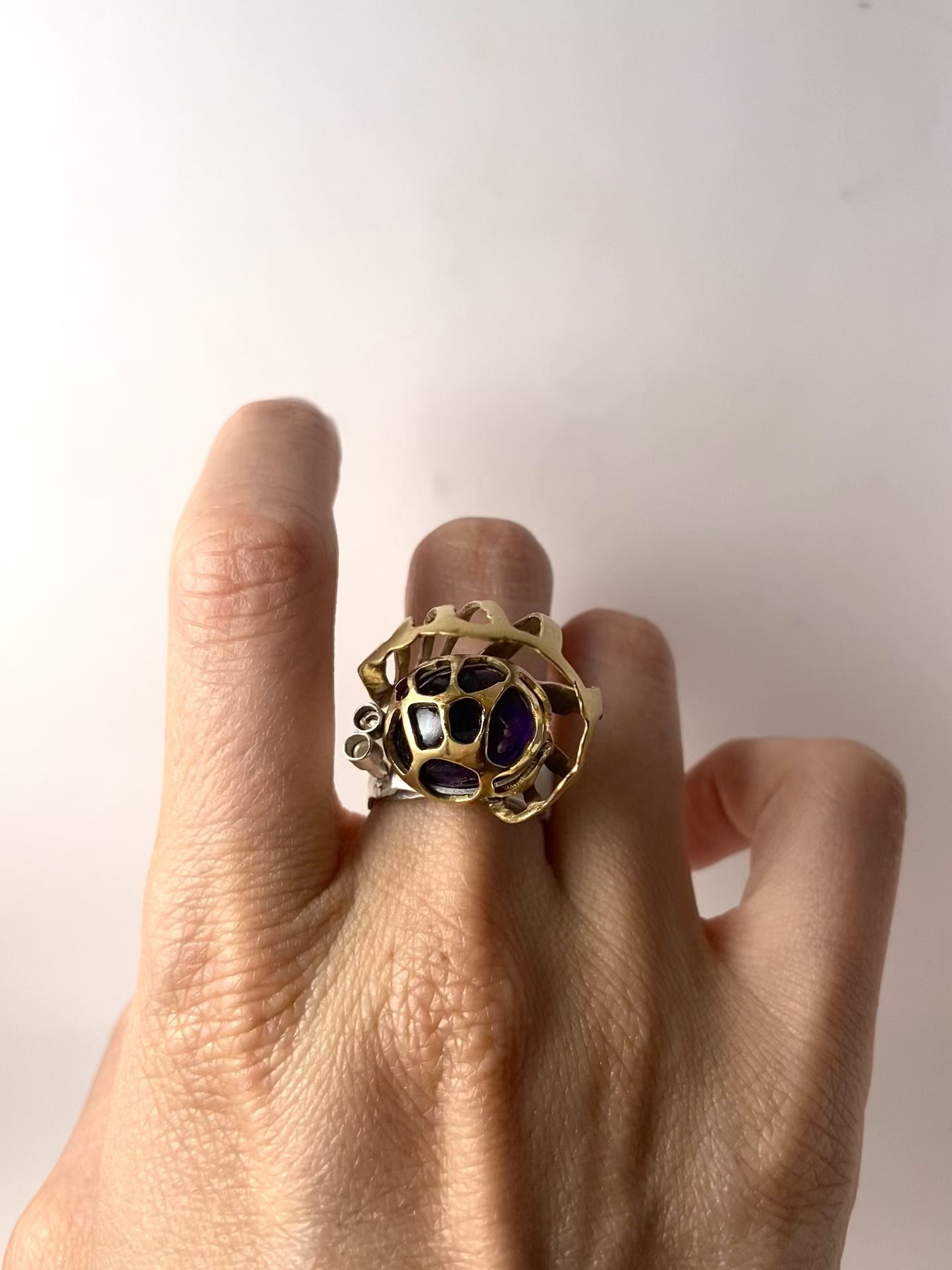Handmade Brass & Silver Ring with Amethyst – Coral-Inspired Statement Jewelry