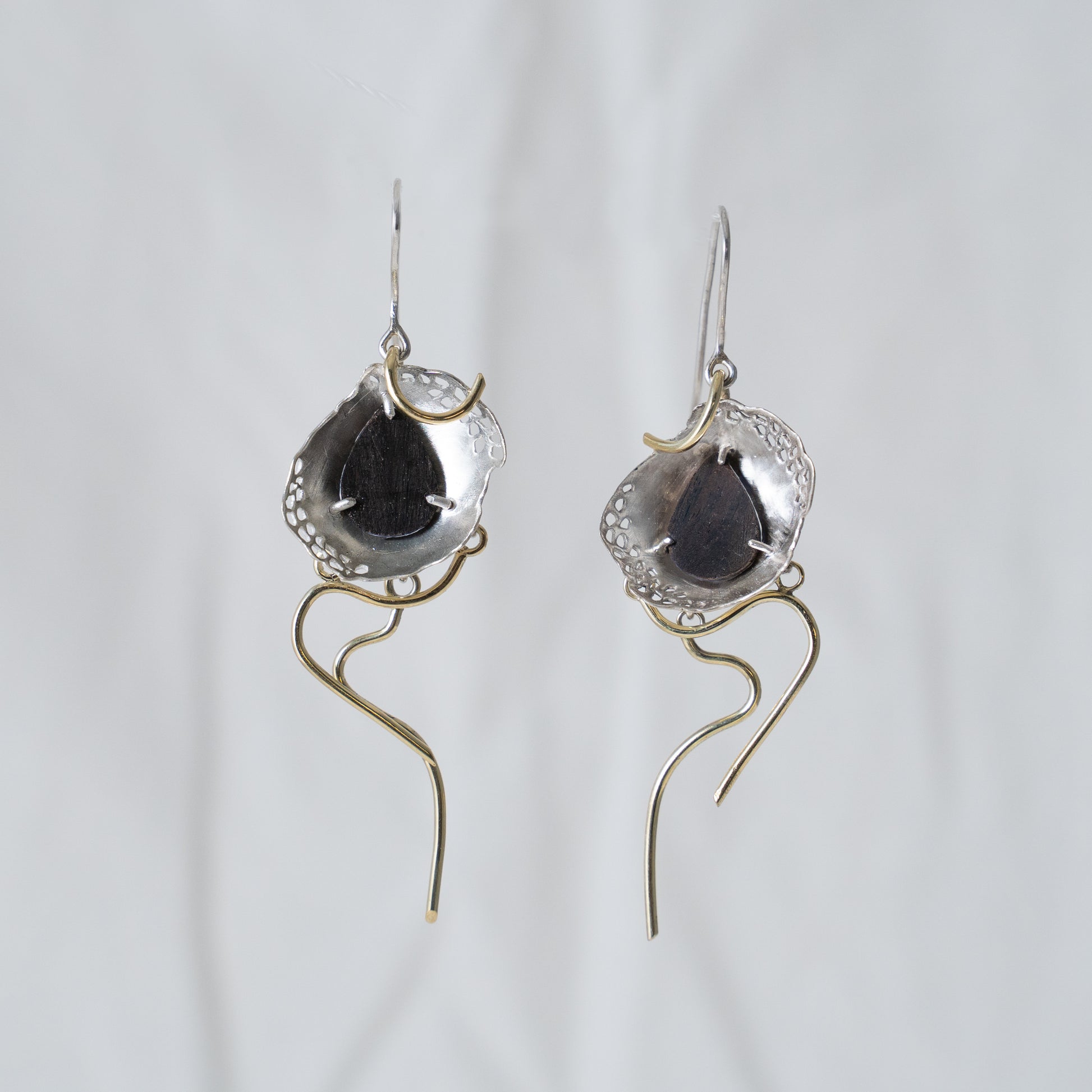 Hiding beneath the flowers, hand fabricated 14k yellow gold with ebony wood hand set in sterling silver dangle earrings