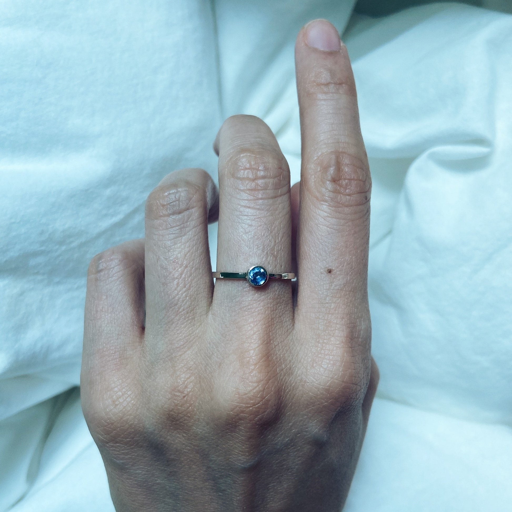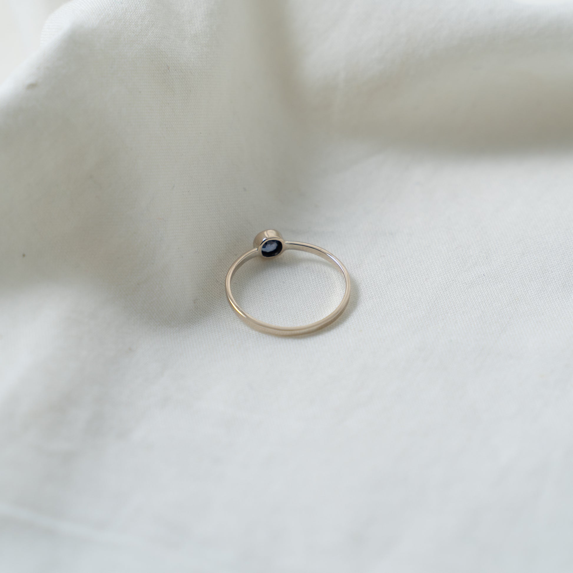 bezel set, round cut, blue sapphire gemstone with a diameter of: 4.7mm.