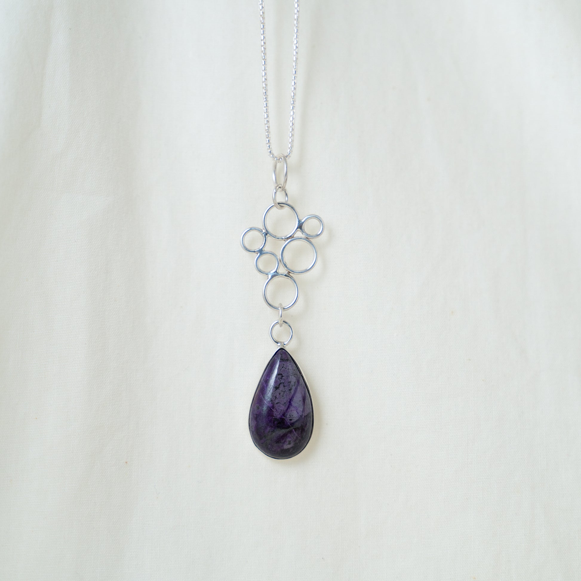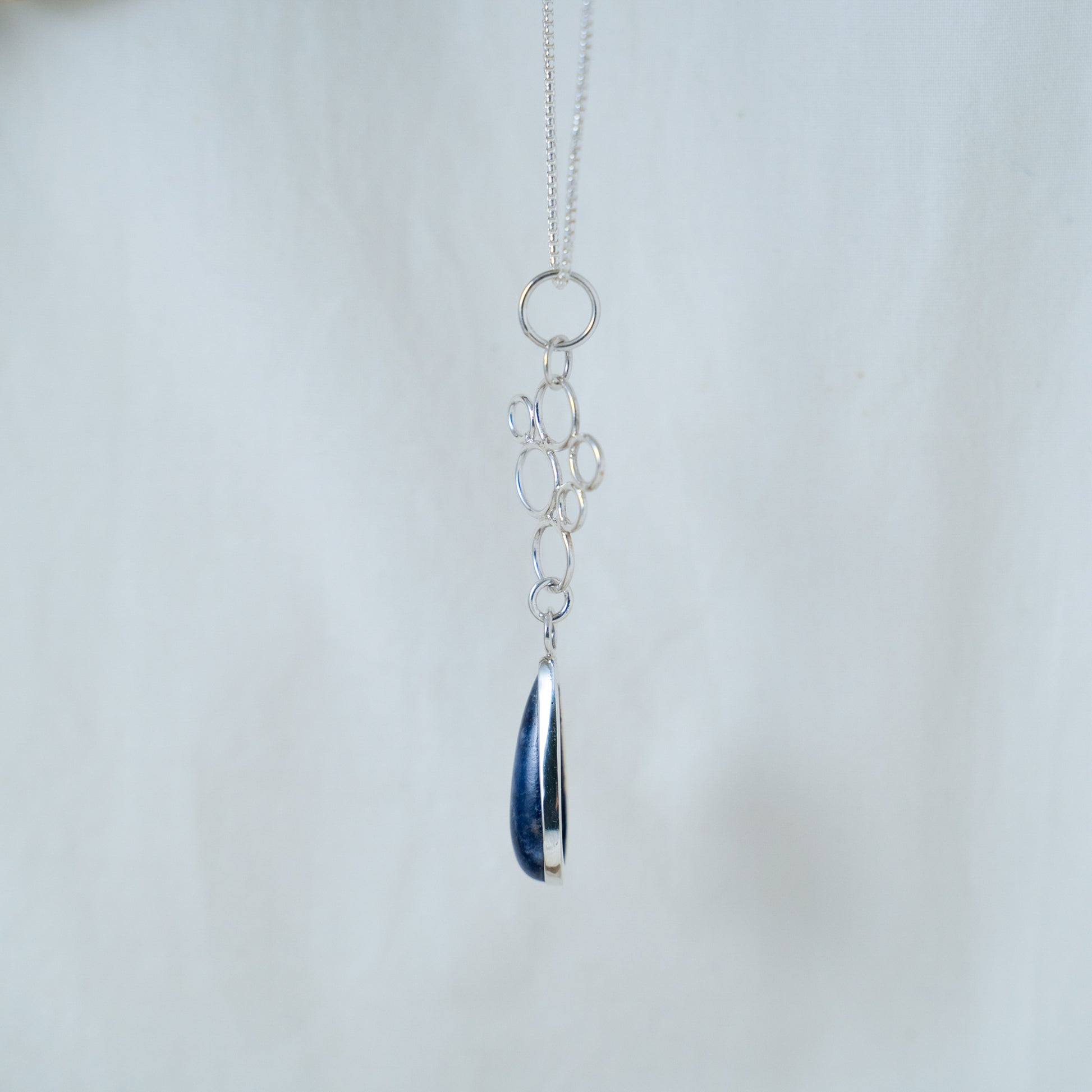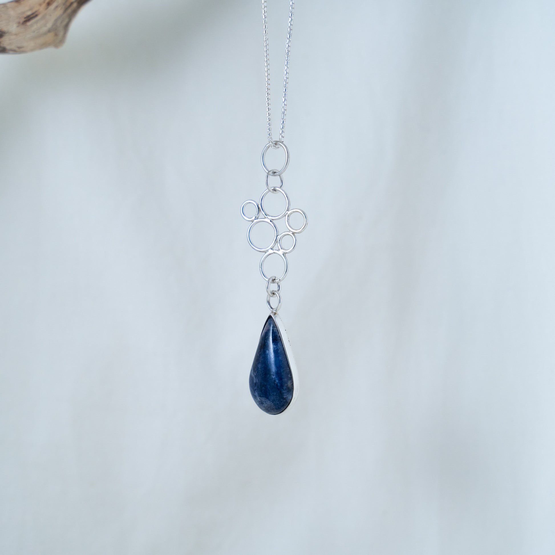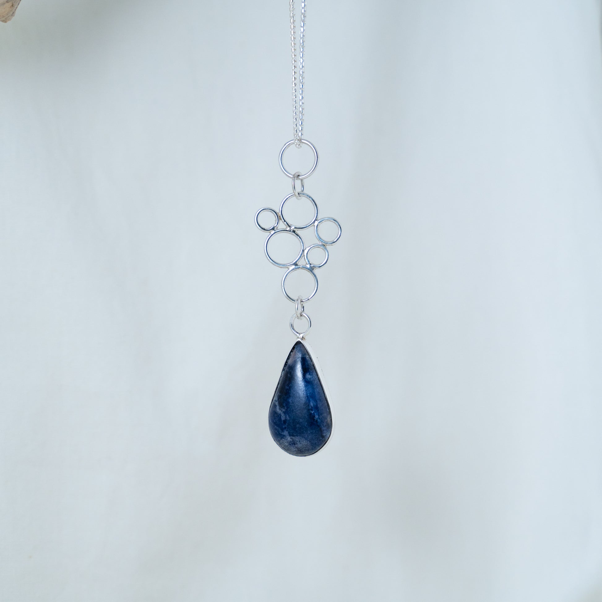 Introducing my lapis lazuli sterling silver circular pendant, an ideal statement accessory that seamlessly blends craftsmanship with style. This piece is meticulously handcrafted, with a lapis lazuli teardrop cabochon expertly set in sterling silver. The necklace boasts a gender-neutral design that radiates both sophistication and charm. I personally handcrafted and set every element of this necklace, meticulously forming each silver circle and skill-fully soldering them together for a seamless finish.