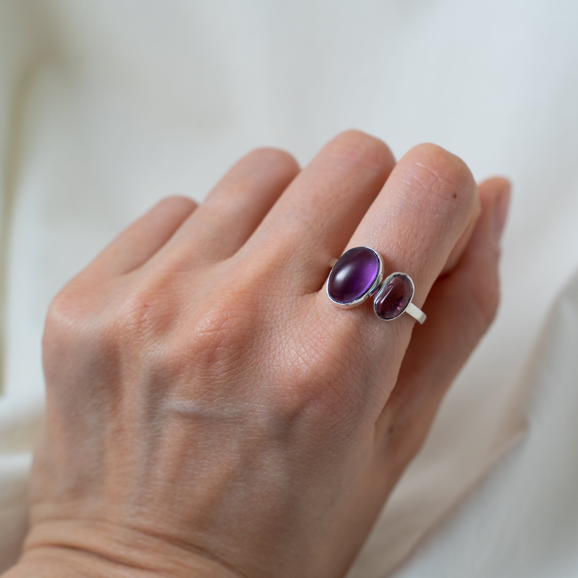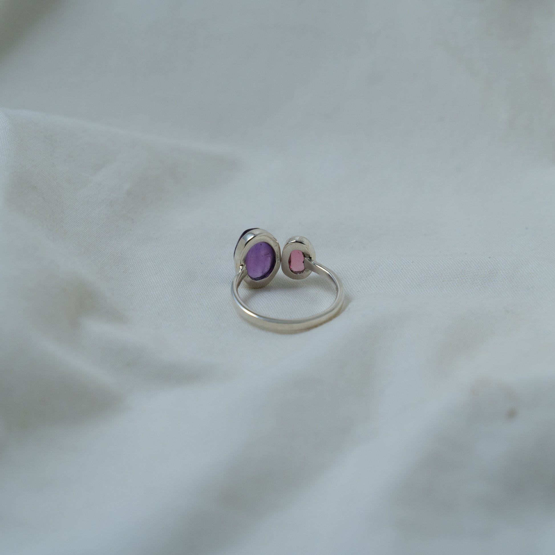Moi Et Toi Amethyst and Pink tourmaline, open, silver ring