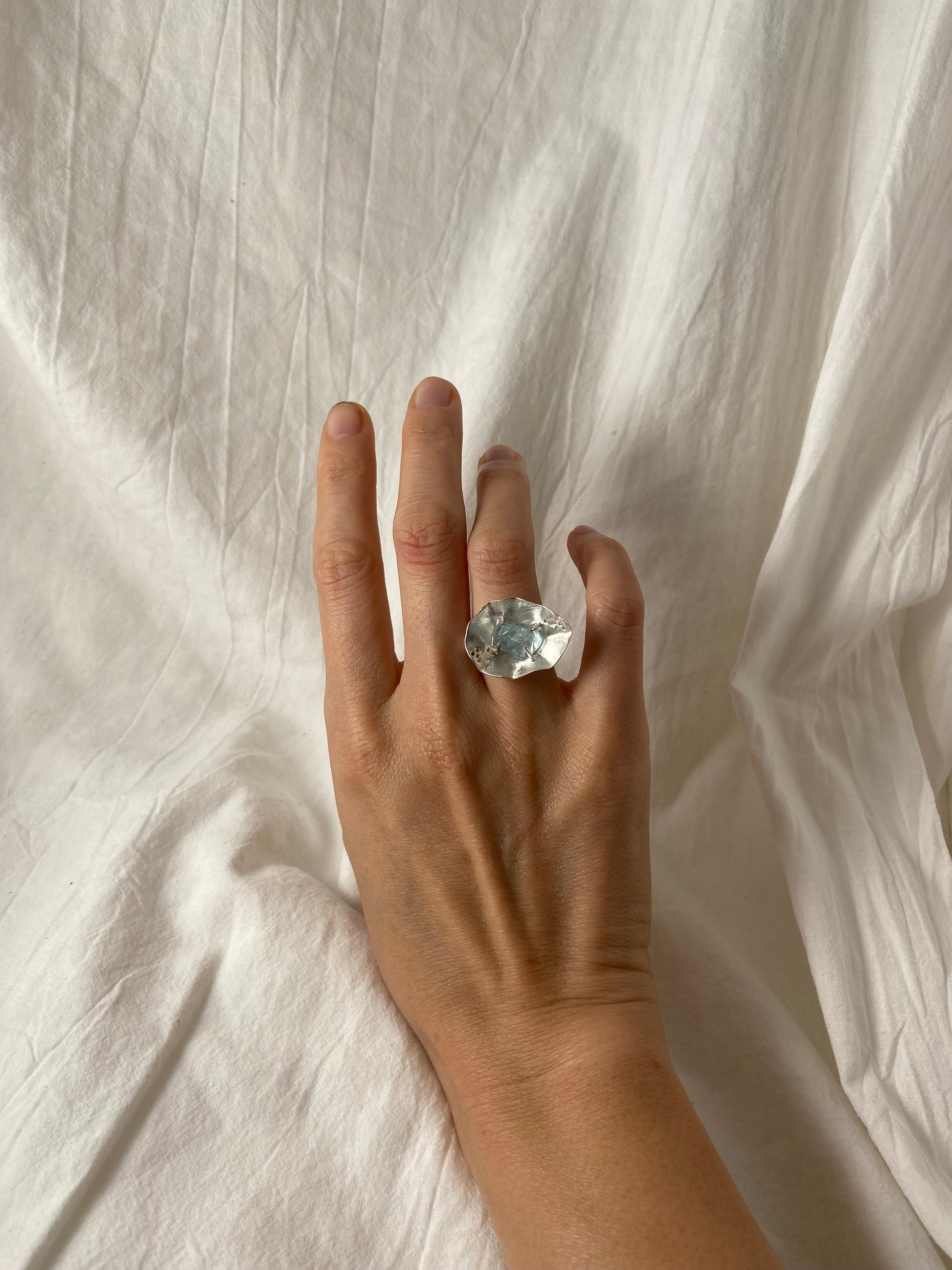 This handcrafted ring is a tribute to the untamed beauty of the ocean and the delicate ecosystems that thrive within it. Inspired by oyster shells and marine textures, it features a raw aquamarine gemstone from Mozambique—left unfaceted to preserve its natural form and tranquil sea-like hue.