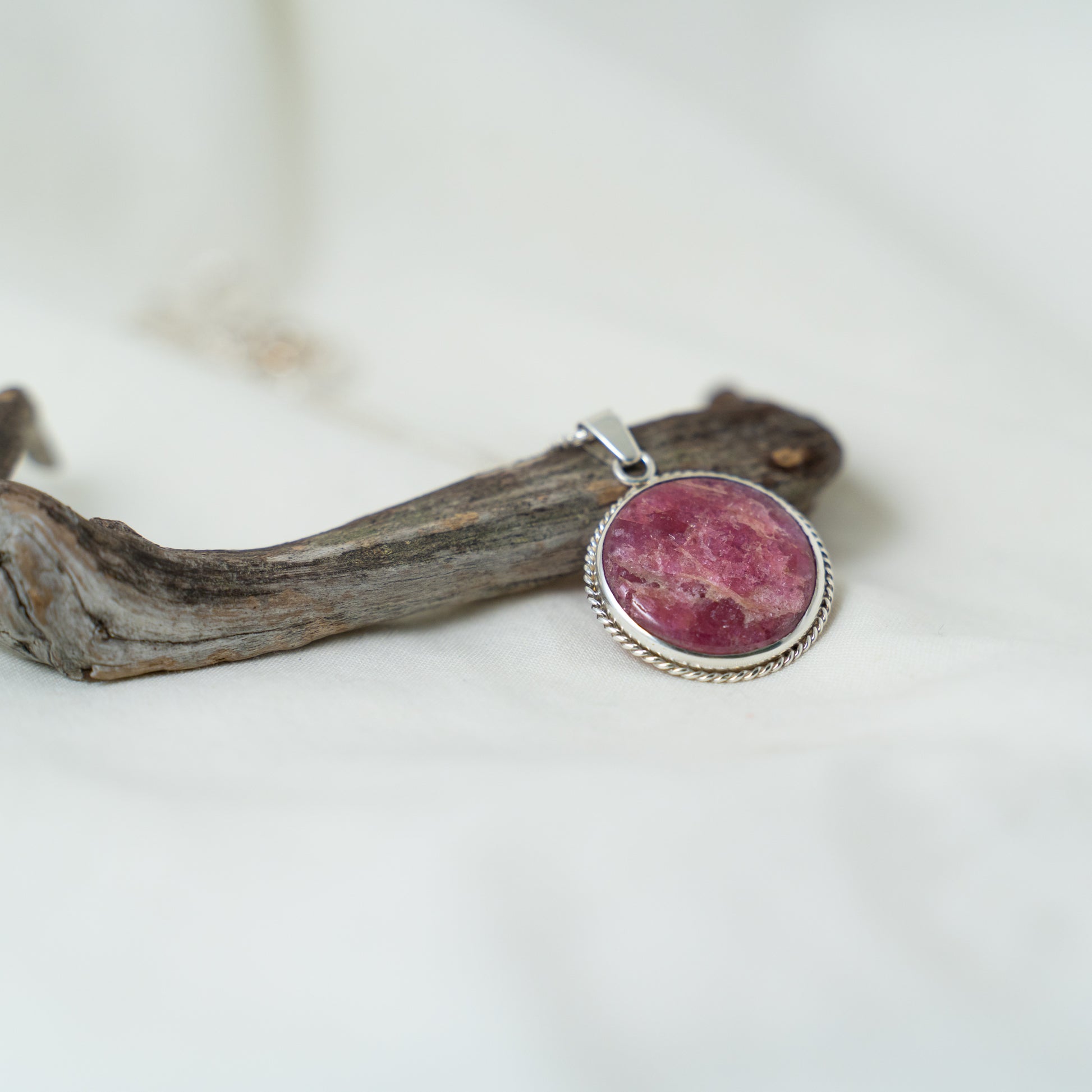Introducing my raw ruby sterling silver pendant, a stunning addition to any ensemble. This authentic piece features a raw ruby stone elegantly set in a twisted sterling silver bezel. Its natural pink hue effortlessly complements any outfit, making it a versatile and eye-catching accessory.
