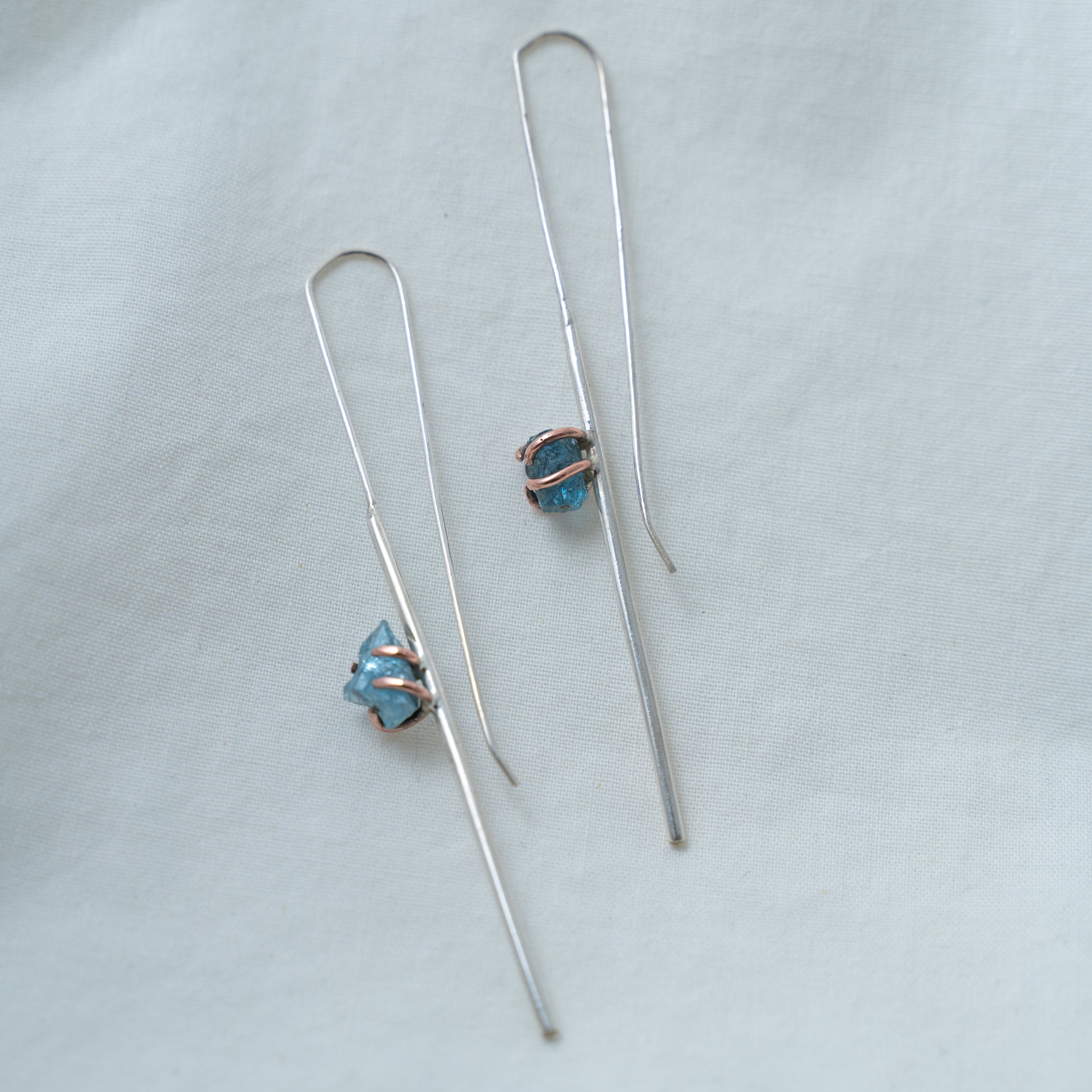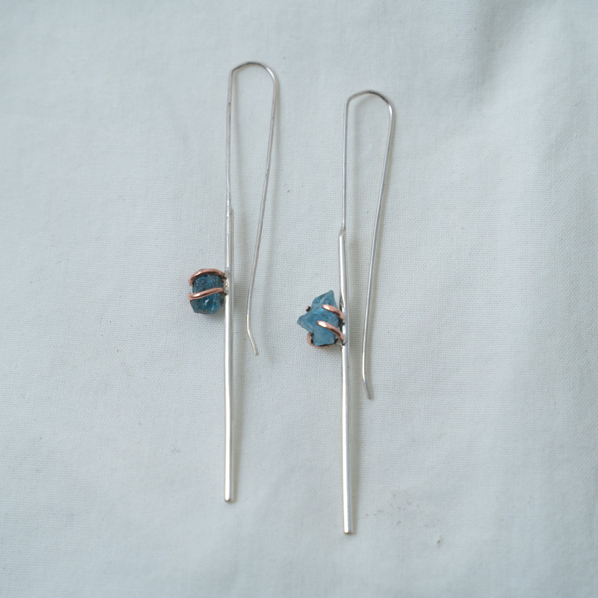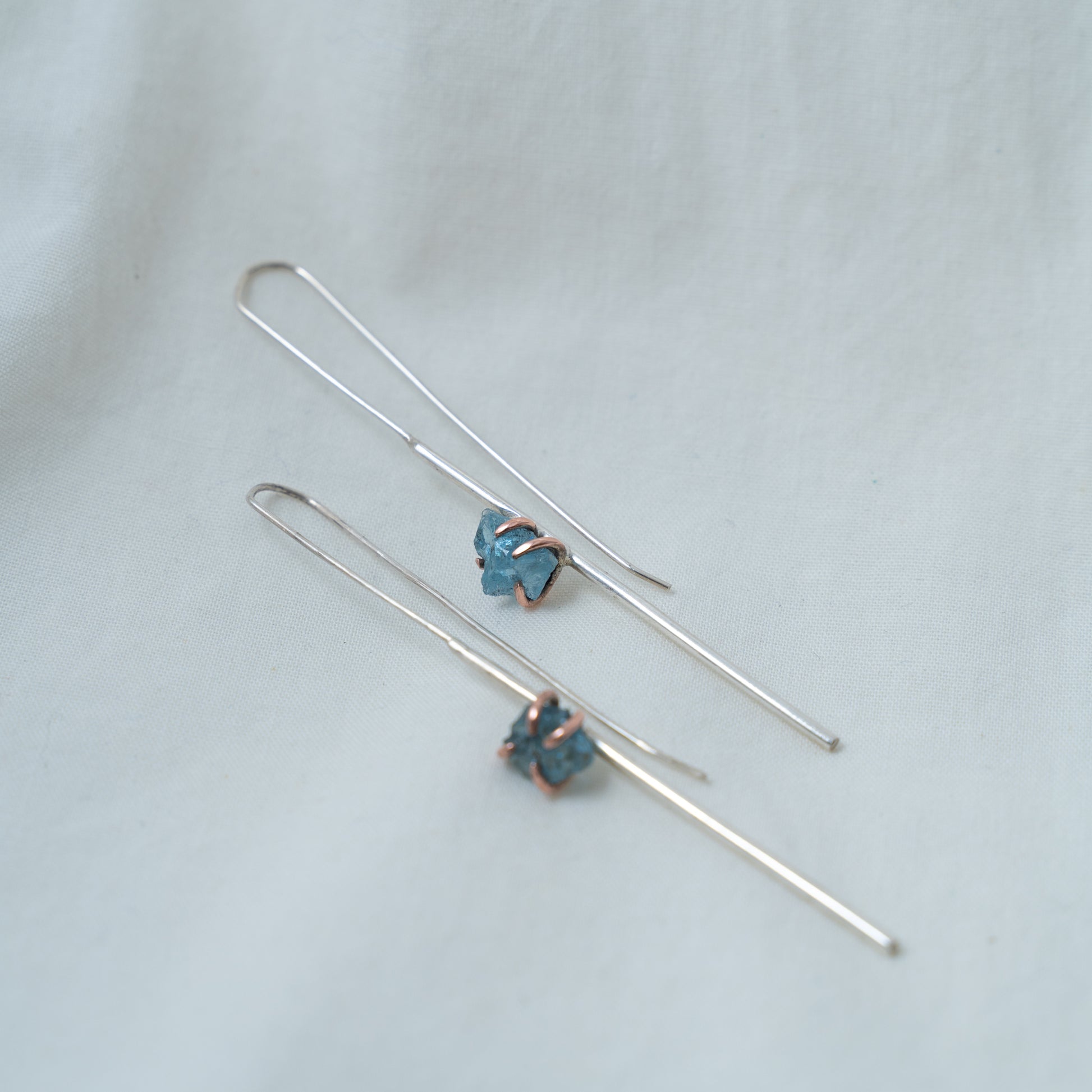 Details: Solid silver earring, copper claws to set the aquamarine and raw aquamarine sourced from Mozambique.