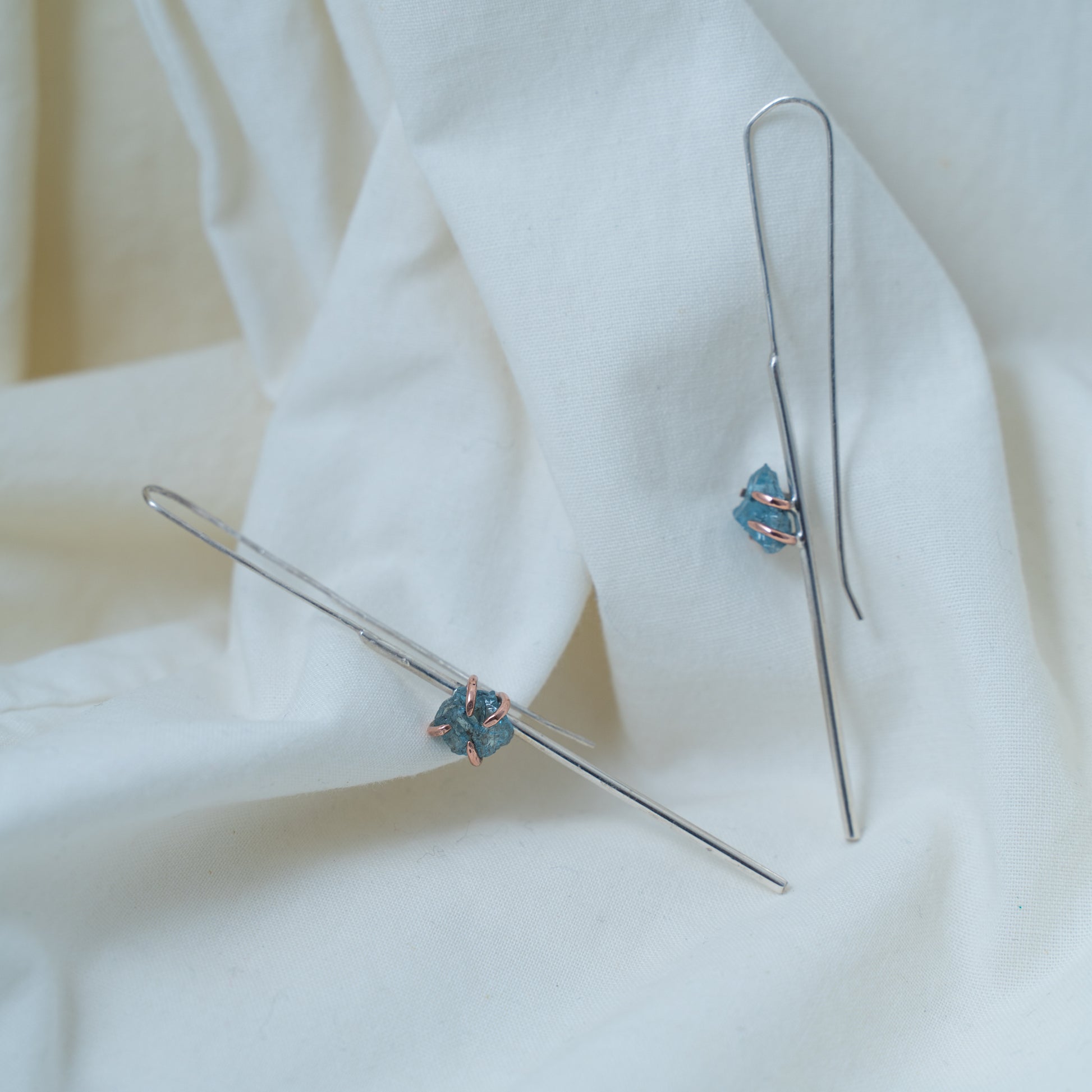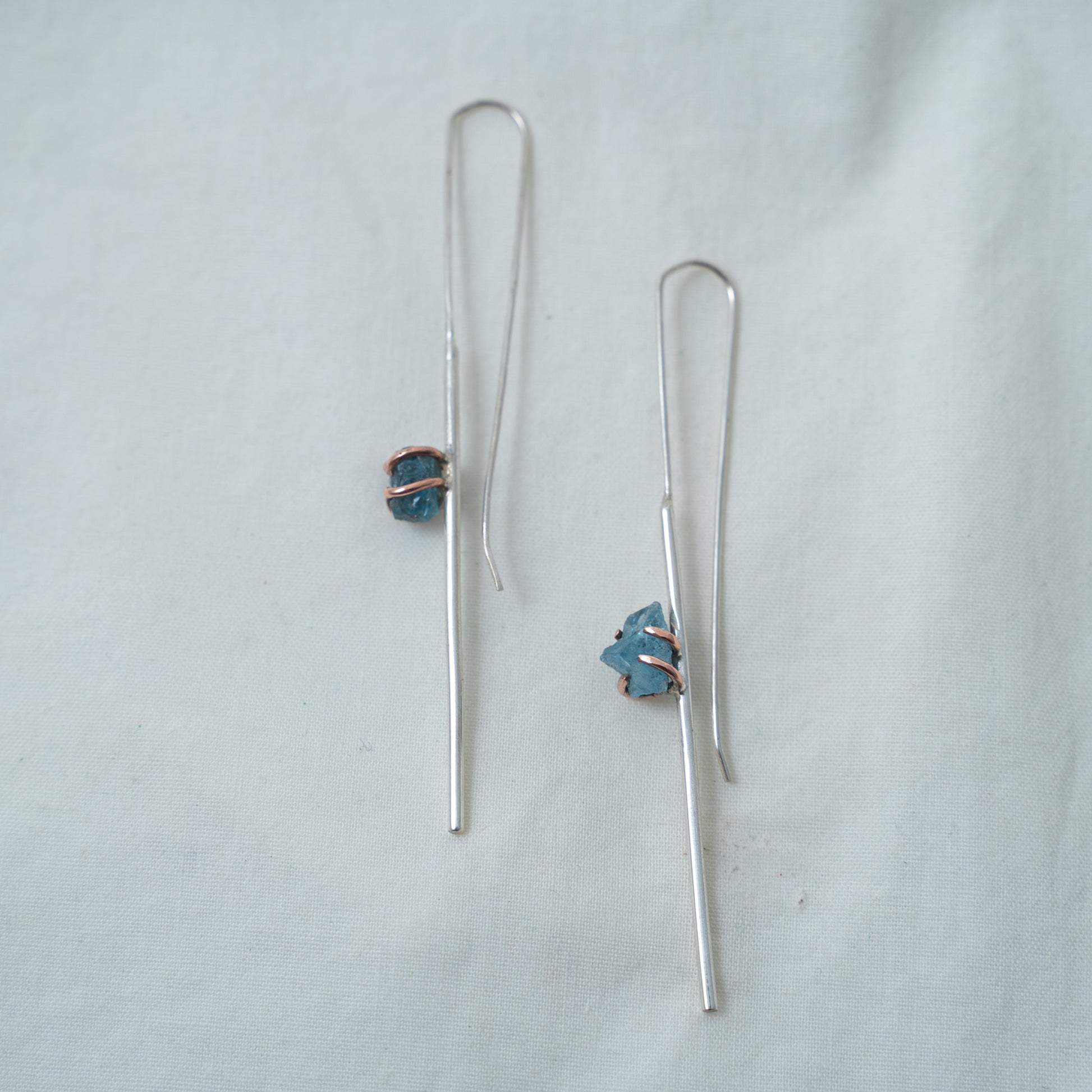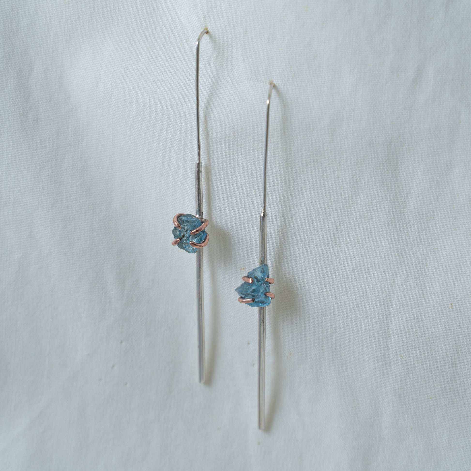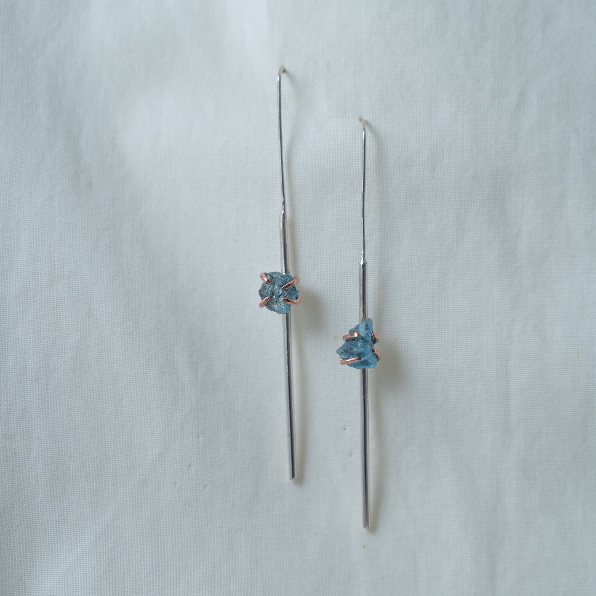 Details: Solid silver earring, copper claws to set the aquamarine and raw aquamarine sourced from Mozambique.