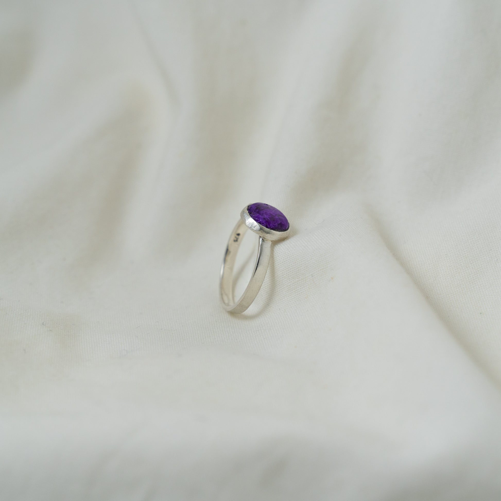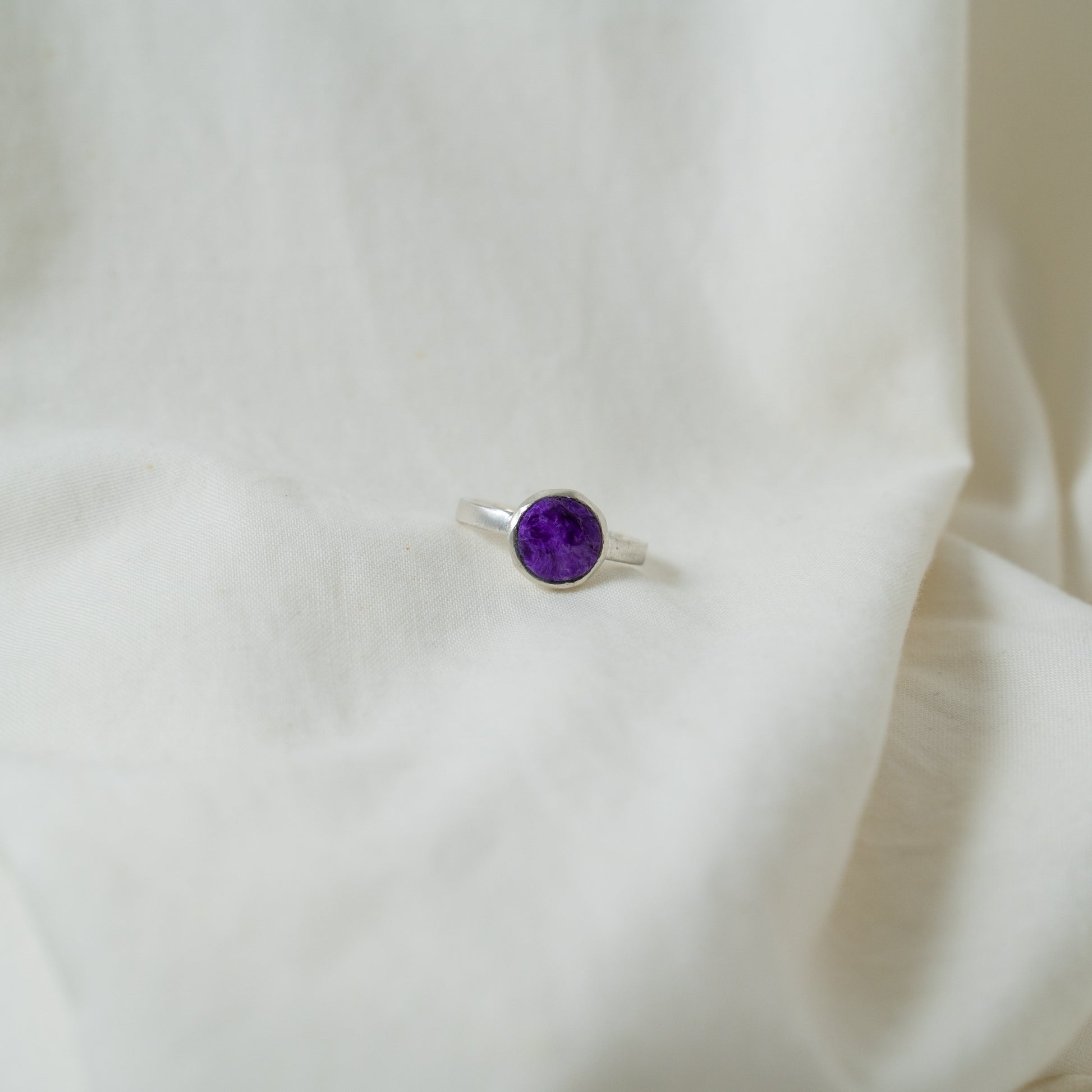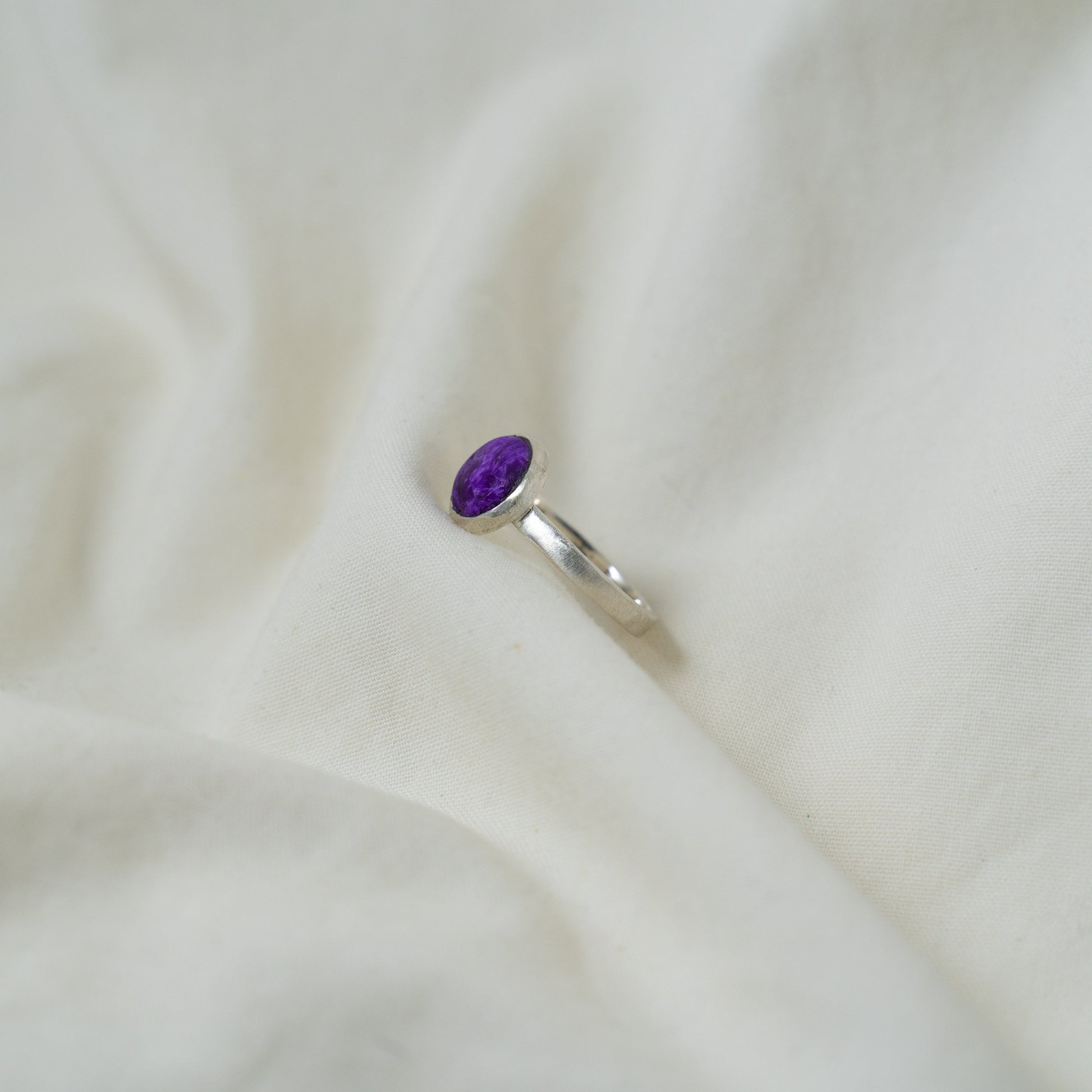 Handcrafted with genuine sugilite, this silver ring is perfect for any occasion. Its one-of-a-kind design with a matte finish is sure to draw attention. Crafted from sterling silver, with a .925 stamp of quality, this hand fabricated ring is durable yet comfortable. Enjoy an accessory that not only looks great but lasts for years to come.