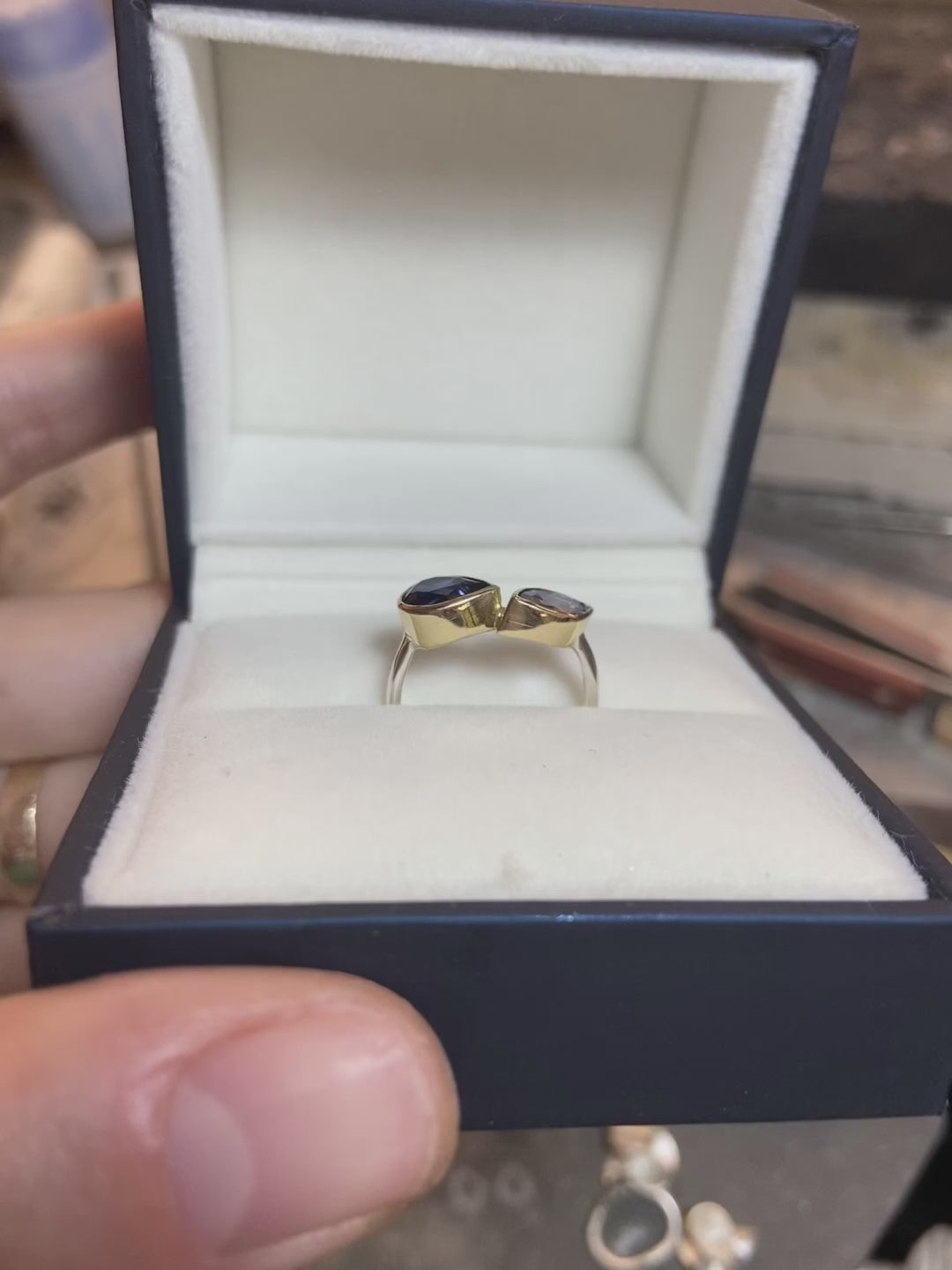 Materials: 18k Yellow gold bezel on a solid sterling silver half round band (comfort fit) with a pear shaped sapphire and client's own marquise shaped sapphire.