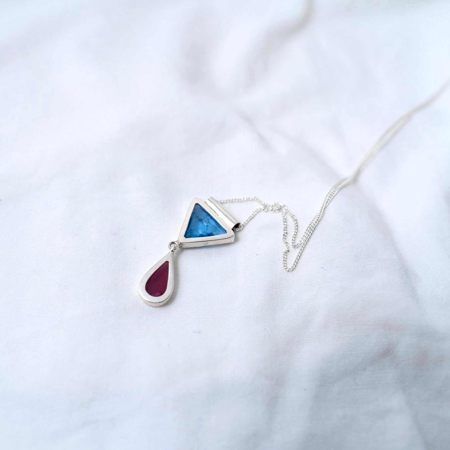 Aquamarine and Garnet, retro-inspired, silver pendant
